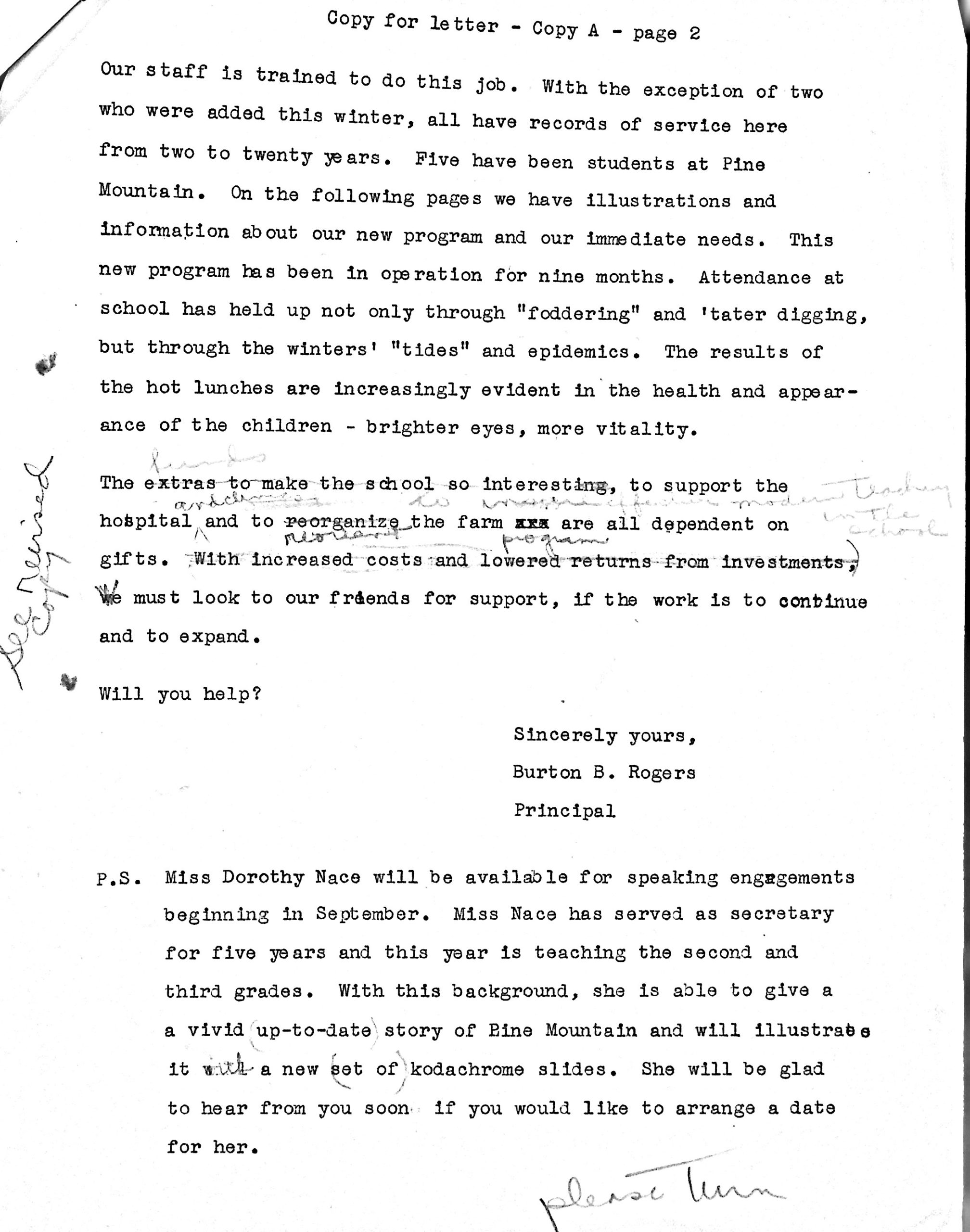 Typewritten draft of “Dear Friend of Pine Mountain” letter with handwritten edits. “Copy for letter – Copy A – page 2.”