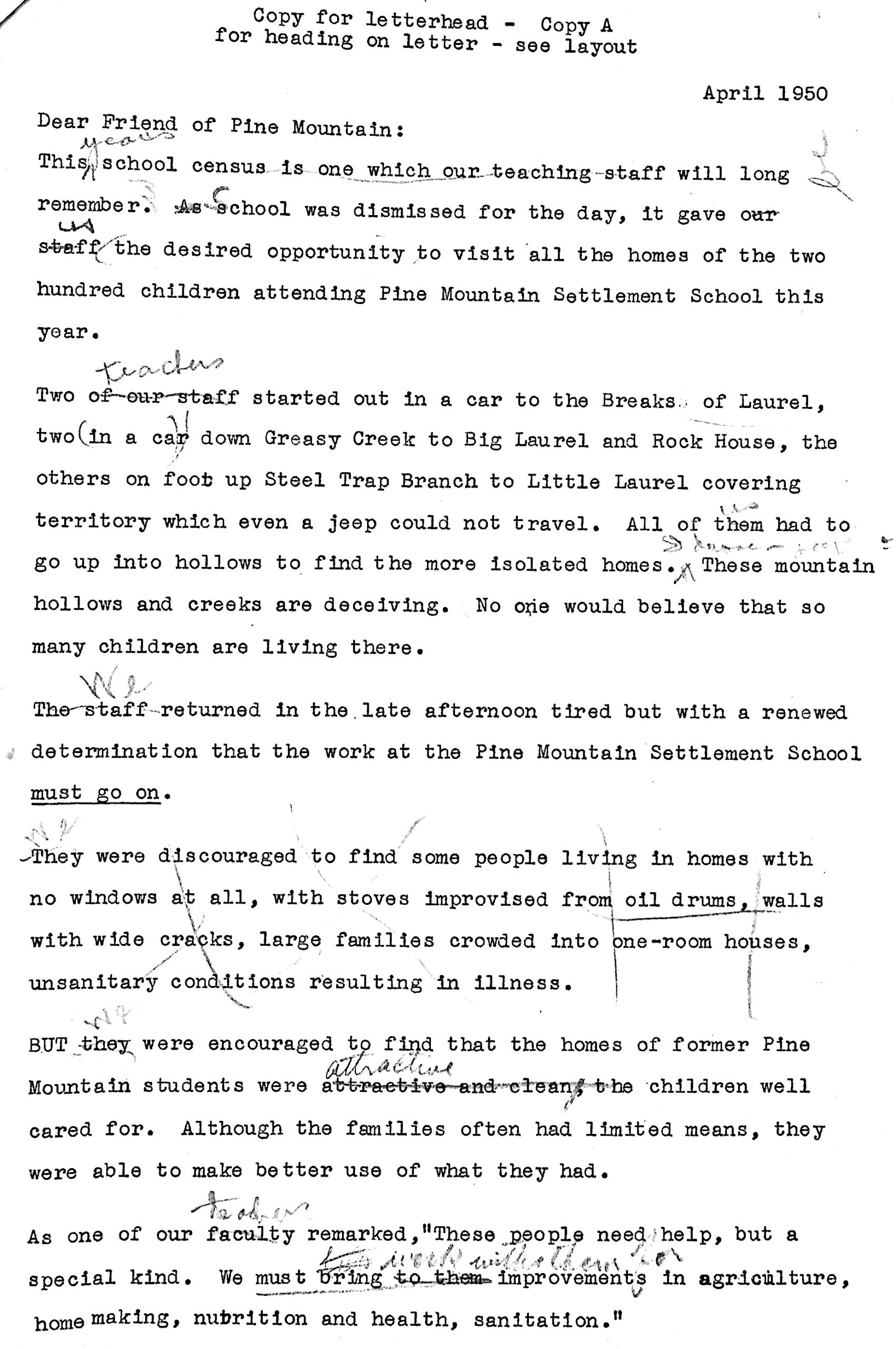 Typewritten draft of Dear Friend of Pine Mountain letter with handwritten edits. “Copy for letterhead – Copy A – for heading on letter – see layout.”