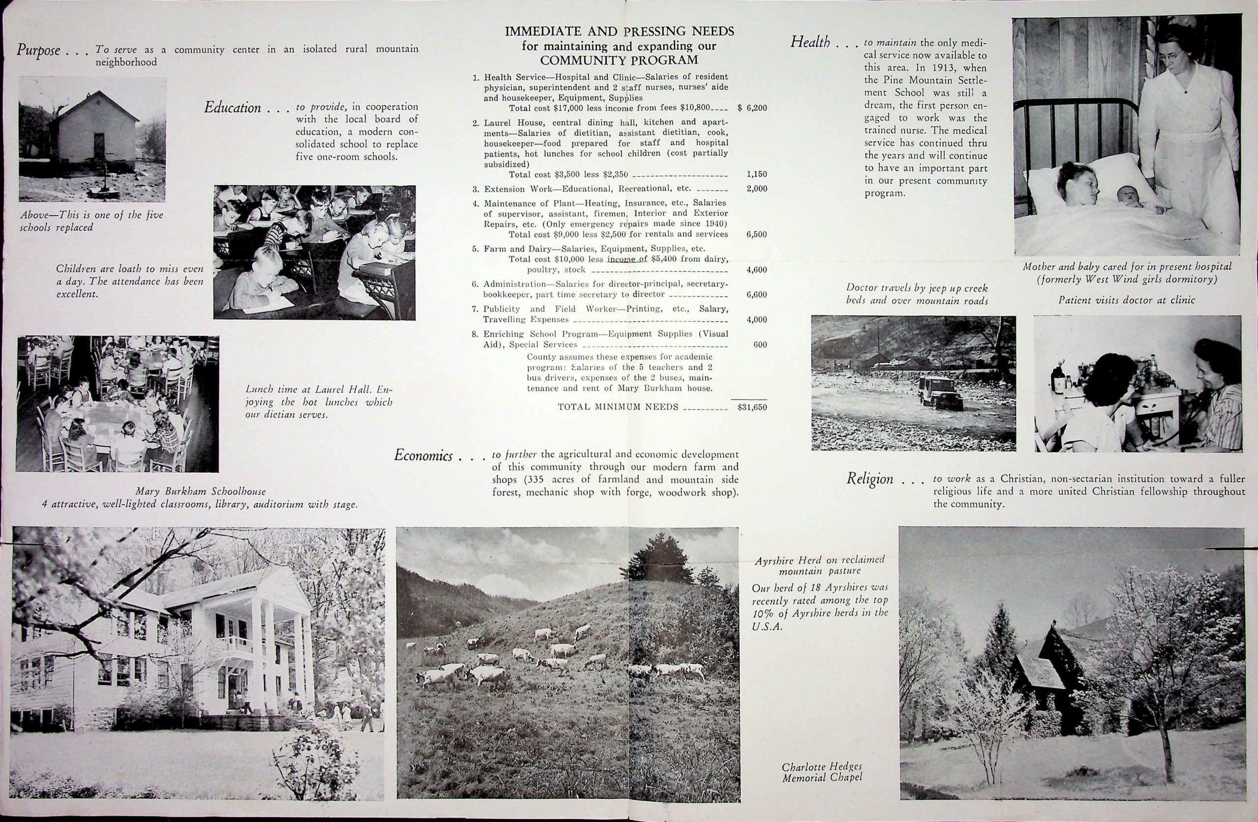 “Physical data: Pine Mountain School has 24 buildings and a tract of 300 acres. Water from a spring-fed reservoir supplies the whole settlement. 20 acres are arable or in pasture. Much of the rest is wooded mountain slopes. The Rural Electrification Administration power line serves the school and community.”