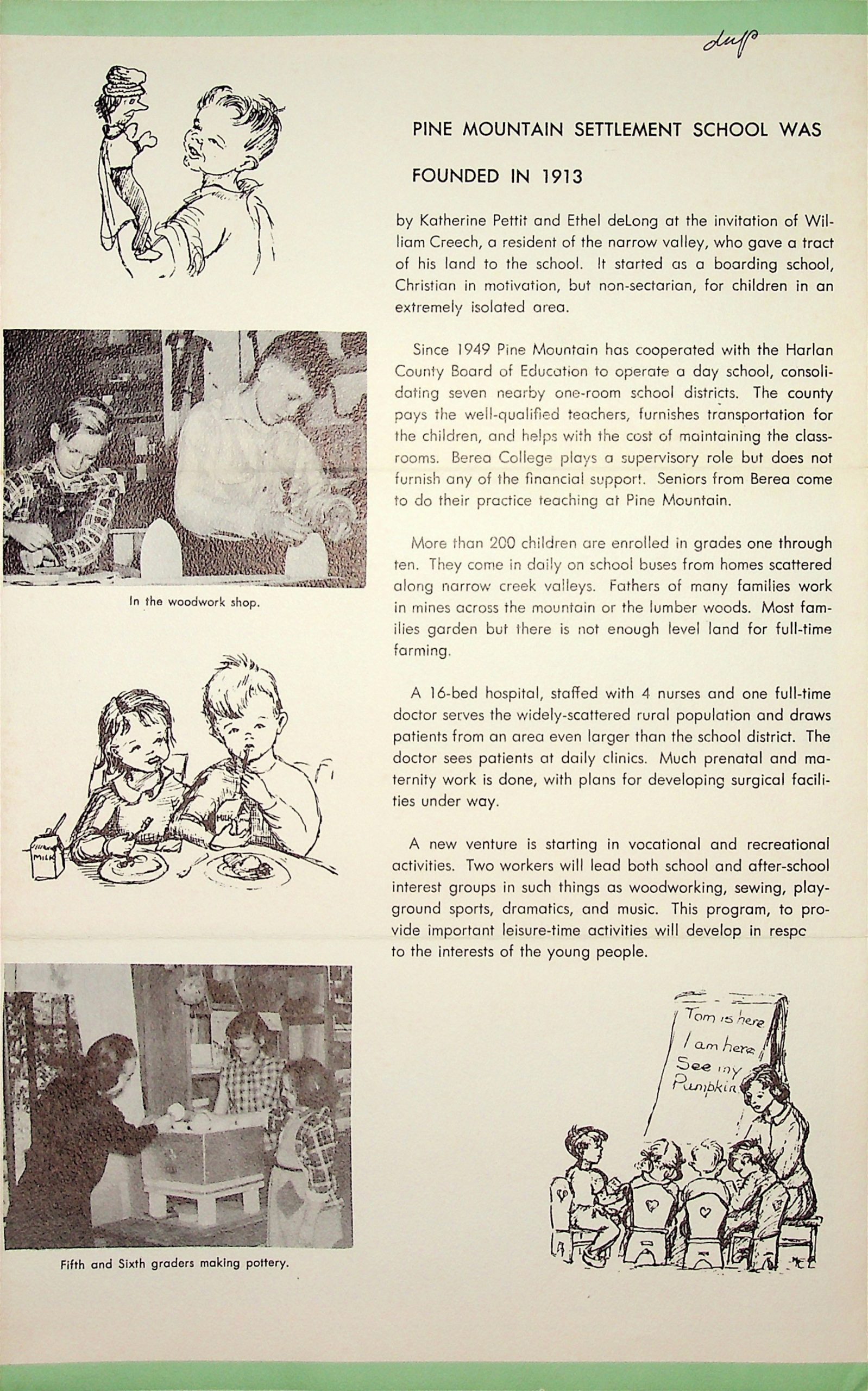 “Pine Mountain Settlement School was founded in 1913….” A short history; the consolidating of one-room school districts in 1949 and its administration; description of the children and their families; the hospital; the start of a new venture in vocational and recreational activities, in which “t]wo workers will lead both school and after-school interest groups in such things as woodworking, sewing, playground sports, dramatics, and music.”