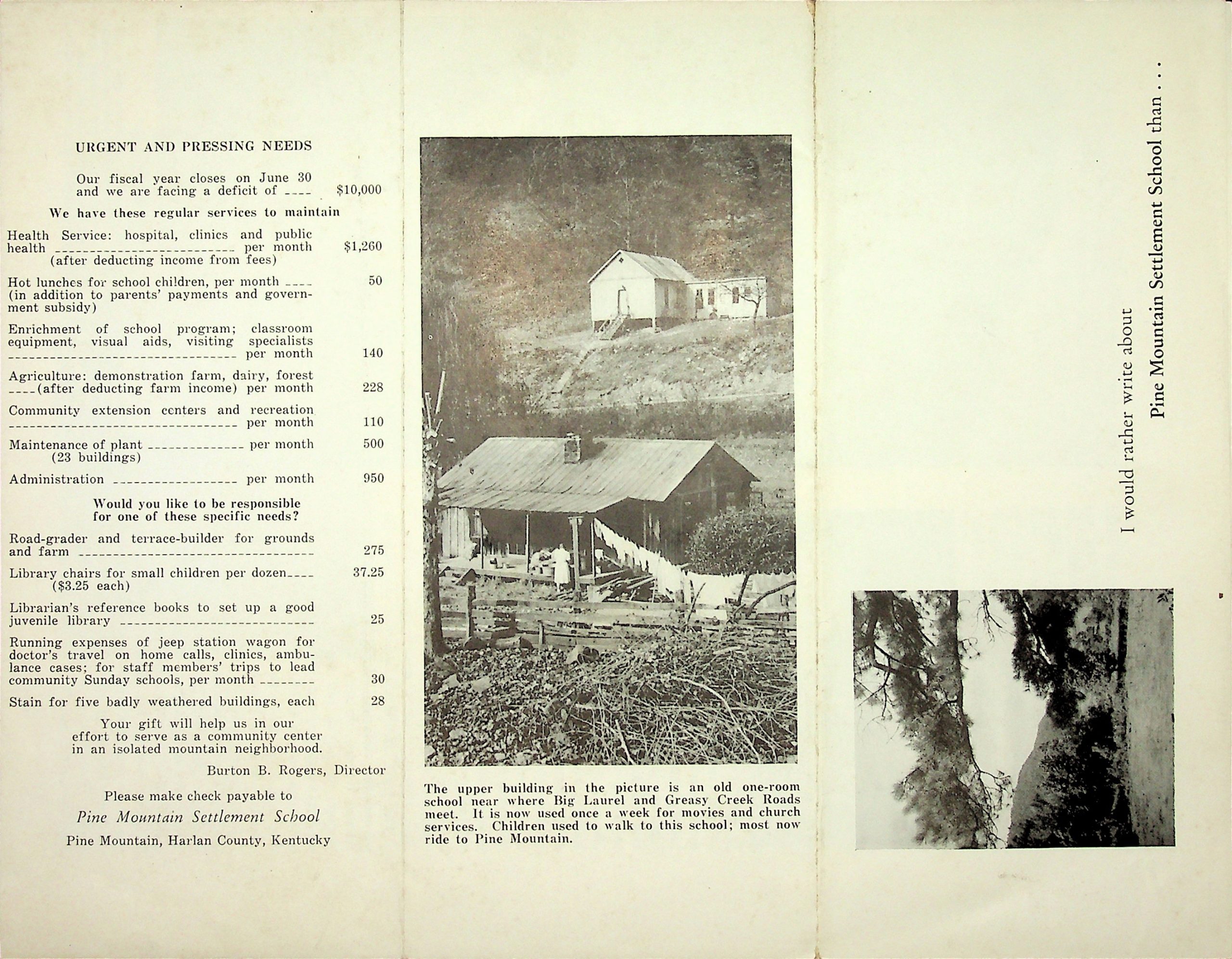 TAGS: Adele Brandeis, Pine Mountain Settlement School history and progress, article from The Louisville-Courier-Journal,fundraising brochure, Harlan County School Board,Berea College,teachers, Nurse Grace Rood,Mary and Burton Rogers,one-room schoolhouses,consolidated elementary school,list of school needs