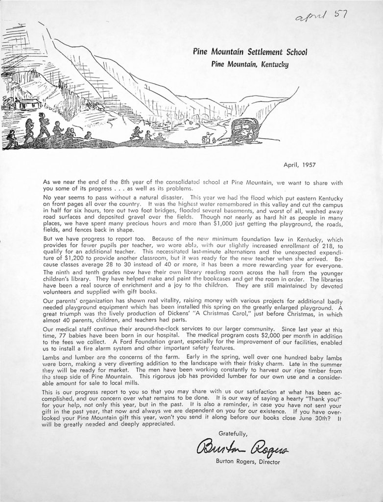 “As we near the end of the 8th year of the consolidated school at Pine Mountain, we want to share with you some of its progress . . . as well as its problems.” Director Burton Rogers describes the damage done by a flood and expense and effort to make repairs.