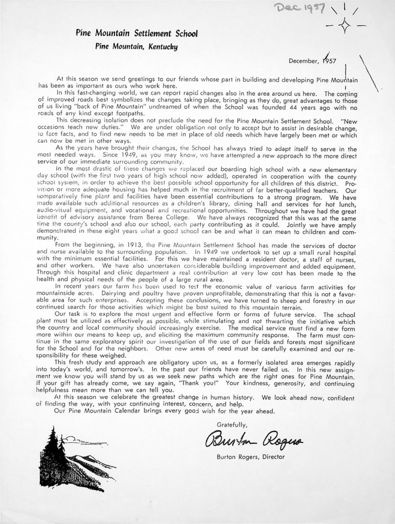 Rogers ends with an appeal for help, thanks those who have already given; refers to the Pine Mountain Calendar apparently enclosed.