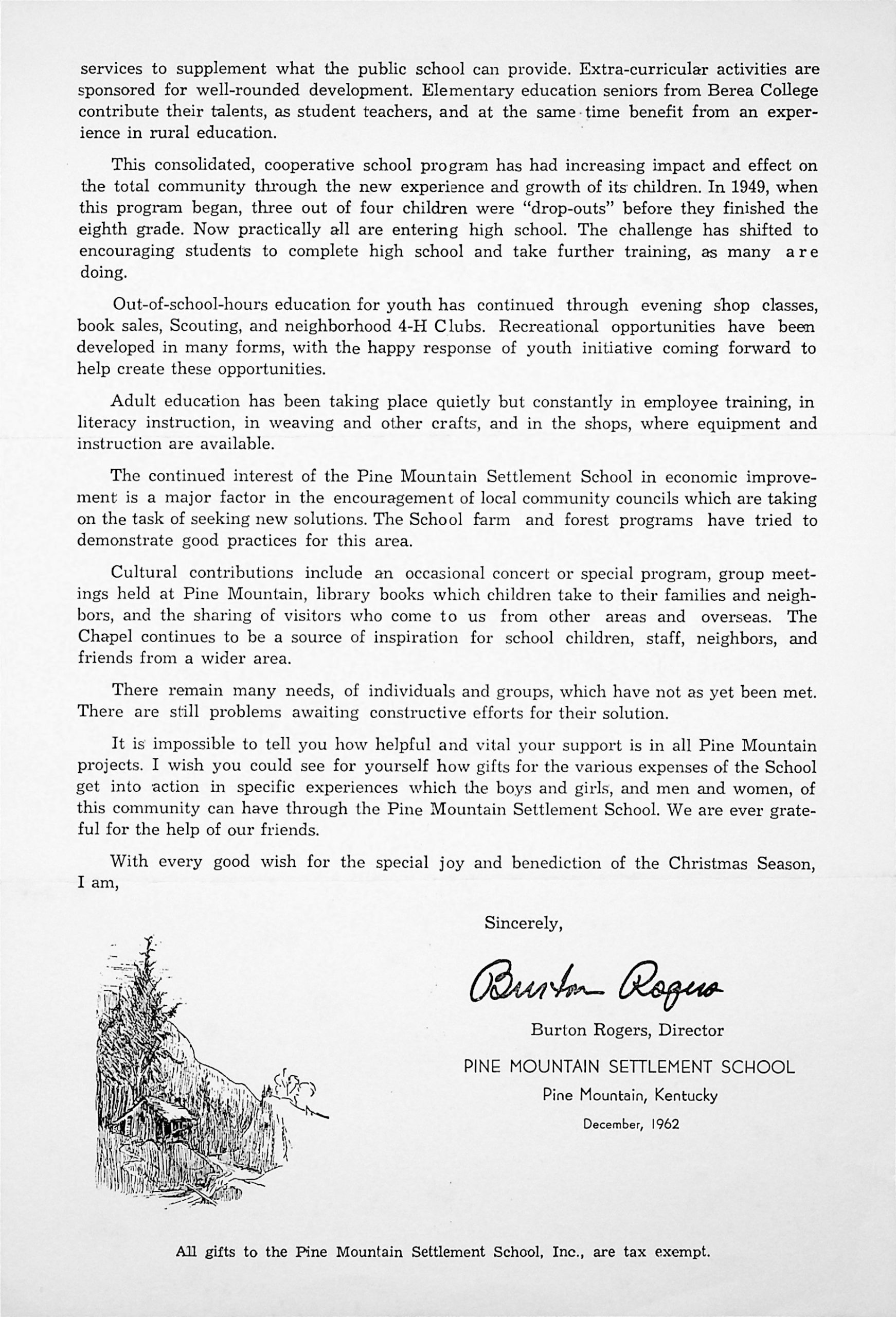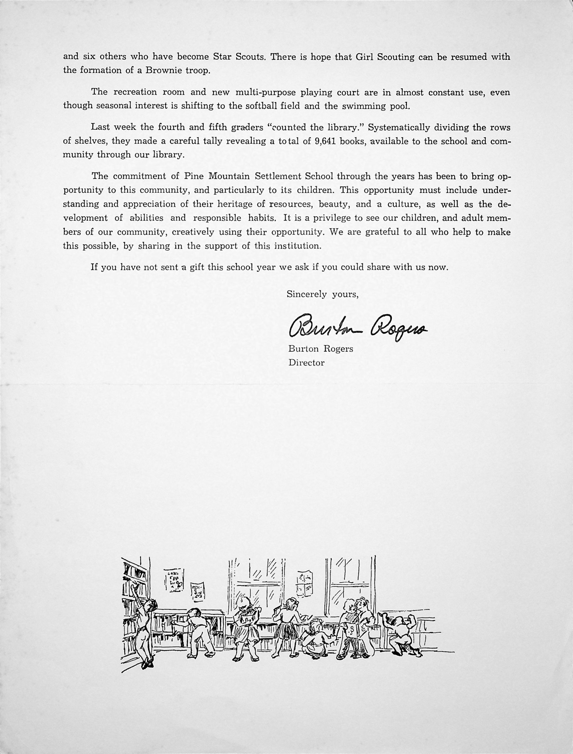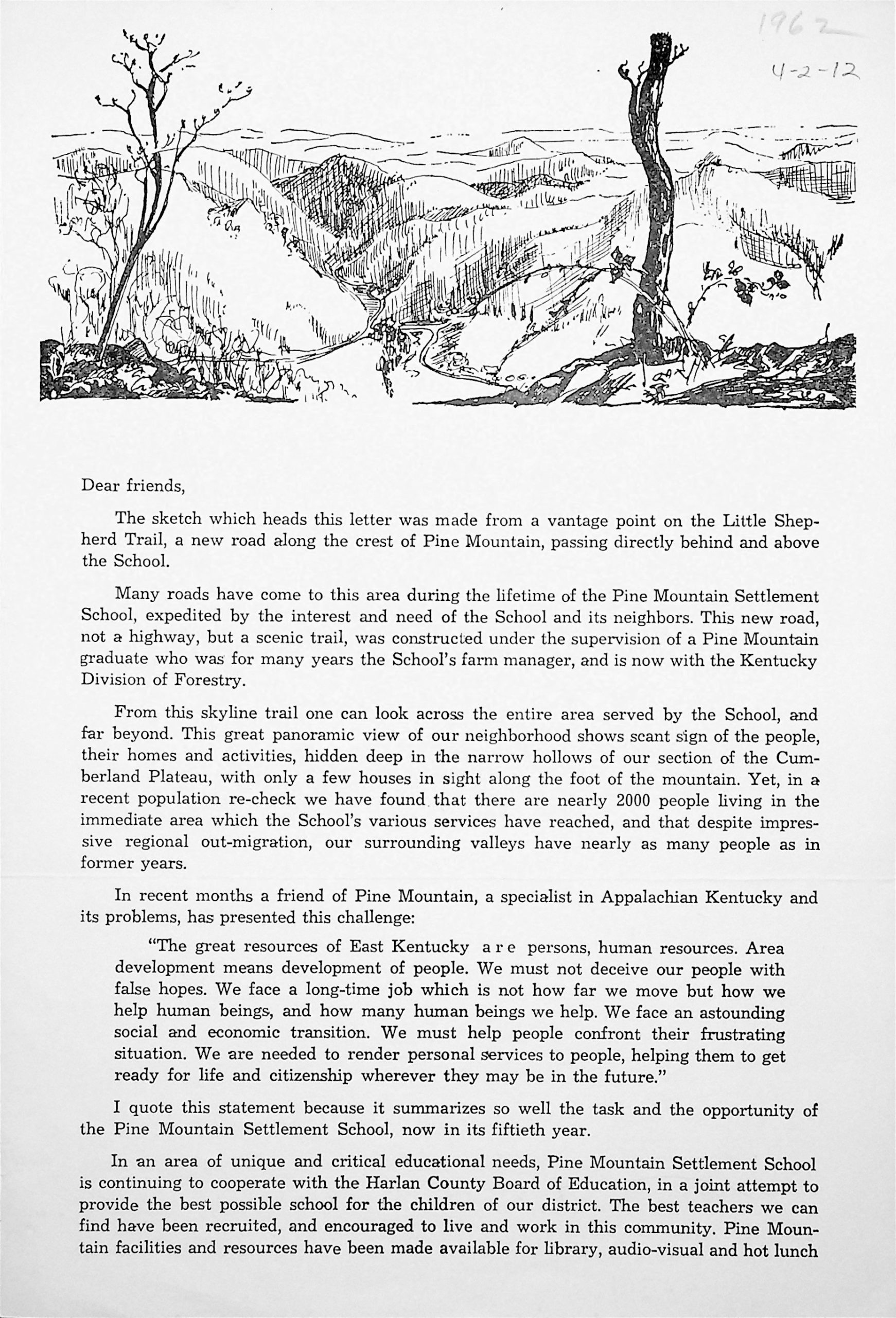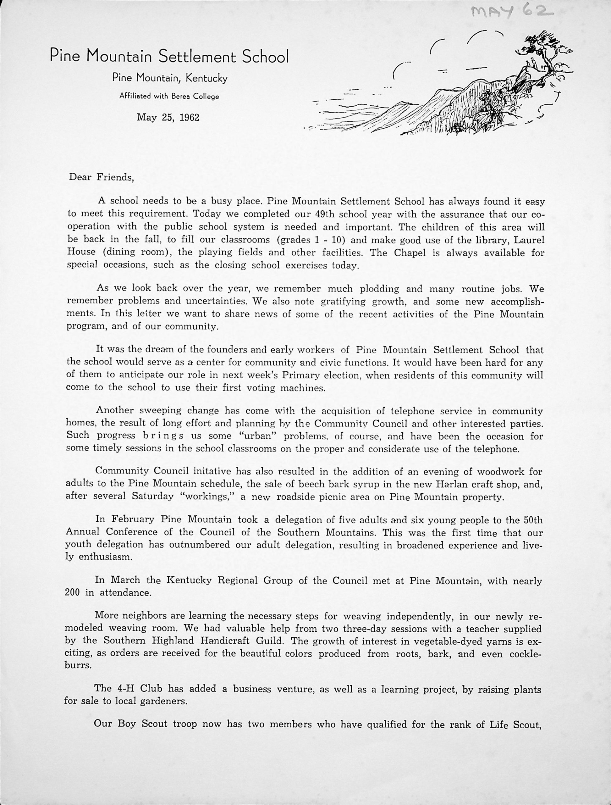 TAGS: Dear Friend letters 1962,fundraising letters,PMSS Director Burton Rogers,Mary Rogers’ sketches,Primary election,community telephone service,Community Council,Council of the Southern Mountains,weaving, Boy Scouts,library,Little Shepherd Trail,William Hayes,cooperative consolidated school program,