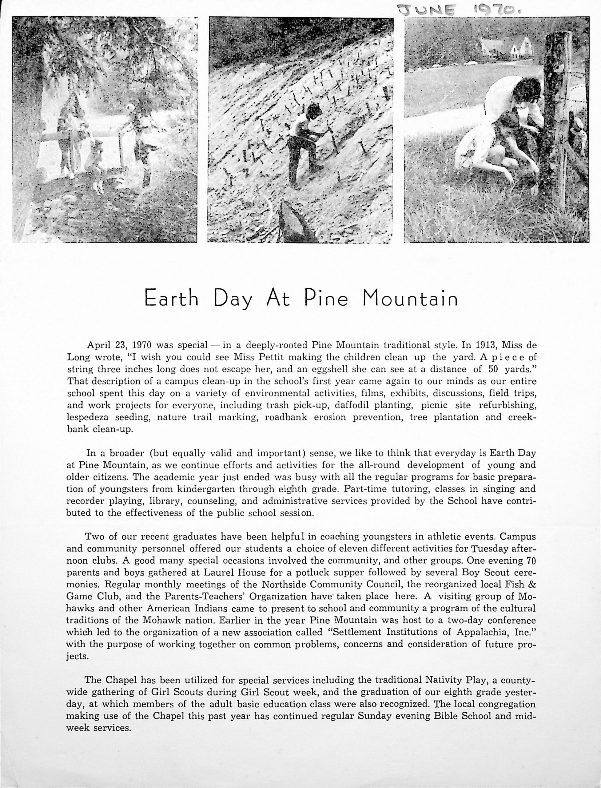 Director Burton Rogers describes the events on April 23, 1970, when “the entire school spent this day on a variety of environmental activities, films, exhibits, discussions, field trips and work projects for everyone.” Rogers lists the various projects.