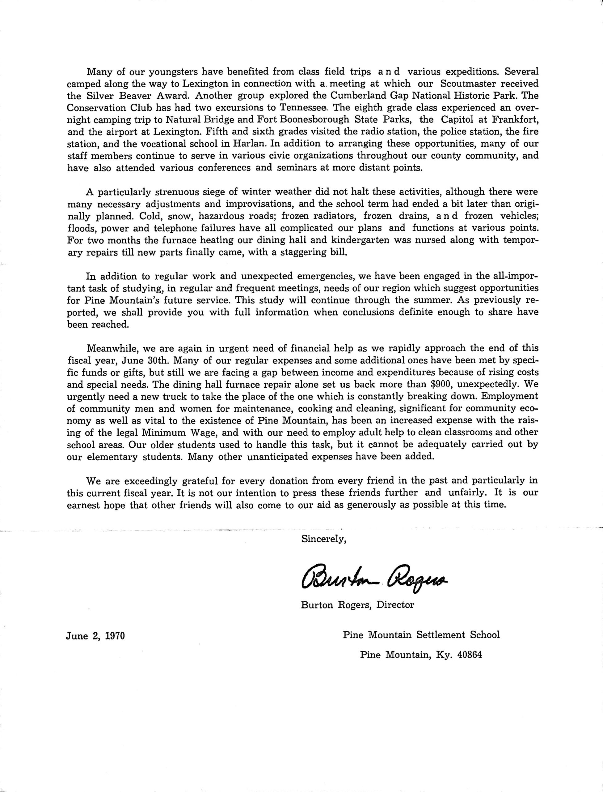 Rogers expresses an urgent need of financial help as the School approached the end of the fiscal year on June 30. Rising costs and special needs created a “gap between income and expenditures.” He gives examples of unanticipated expenses, such as building maintenance needs and the raising of the legal Minimum Wage.