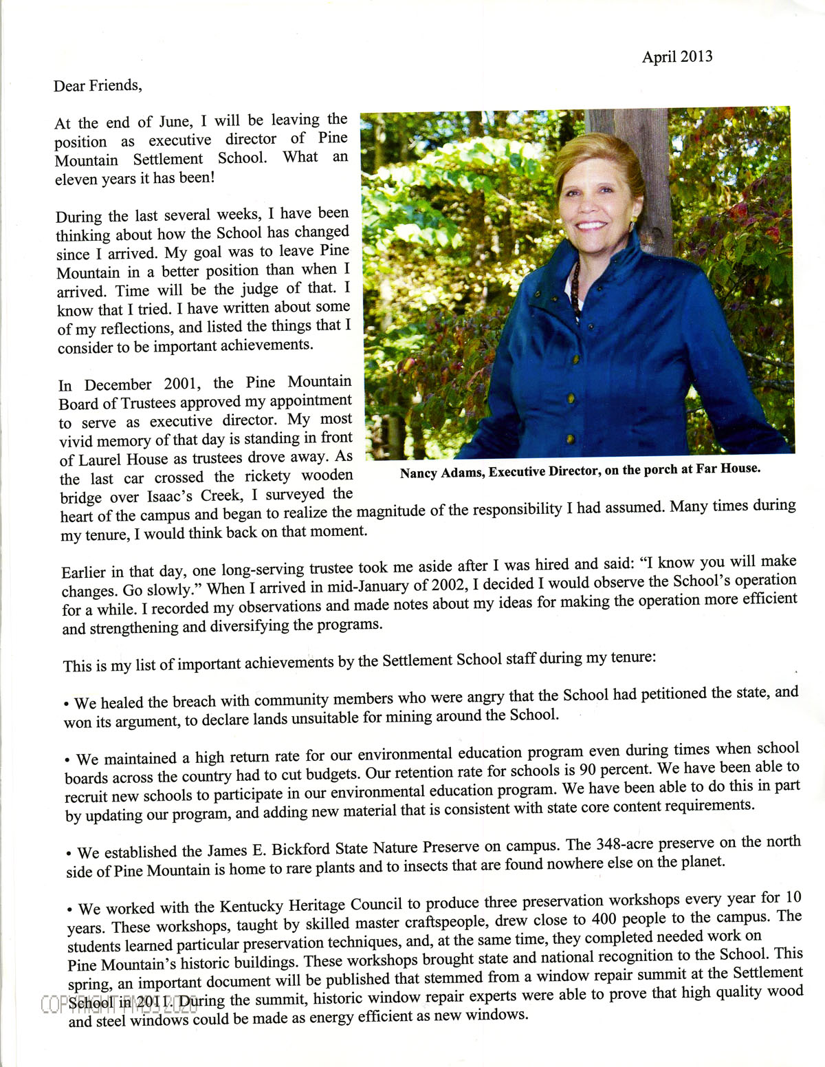 [002] Nancy Adams [image], Executive Director 2002-2013 ; community members ; lands unsuitable for mining ; environmental education ; James E. Bickford State Nature Preserve ; Kentucky Heritage Council ; preservation workshops ; historic window repair summit ;