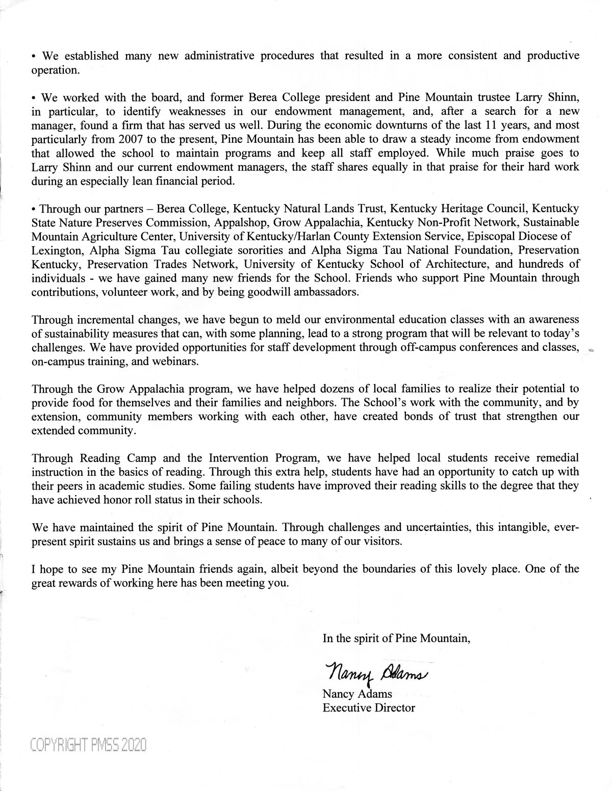 [004] Larry Shinn, former Berea College president and PMSS trustee ; endowment management ; partners with PMSS [see list] ; donors ; volunteers ; goodwill ambassadors ; sustainability measures ; staff development ; Grow America program ; community members ; Reading Camp ; Intervention Program ; remedial instruction in reading ; spirit of Pine Mountain ;