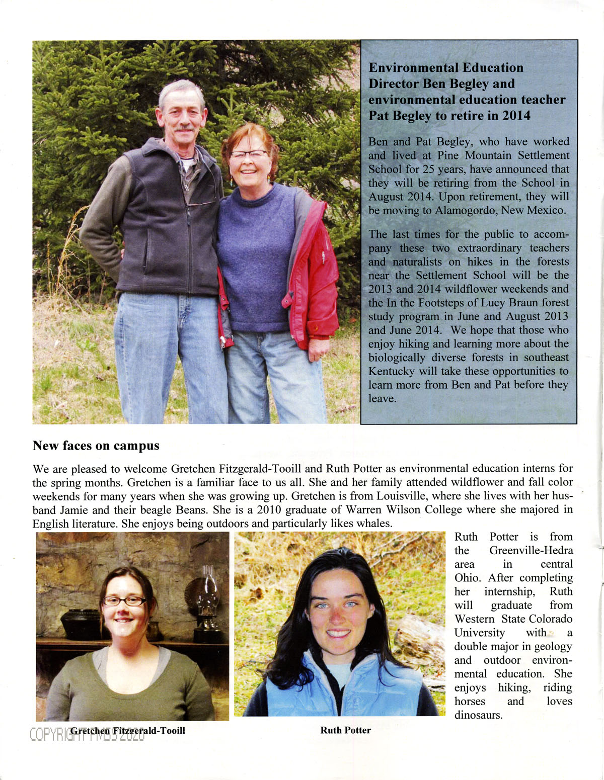 [005] Environmental Education Director Ben Begley and environmental education teacher, Pat Begley, to retire in 2014 [image] ; wildflower weekends ; In the Footsteps of Lucy Braun forest study program ; biologically diverse forests ; Gretchen Fitzgerald-Tooill ; Ruth Potter ; interns ;