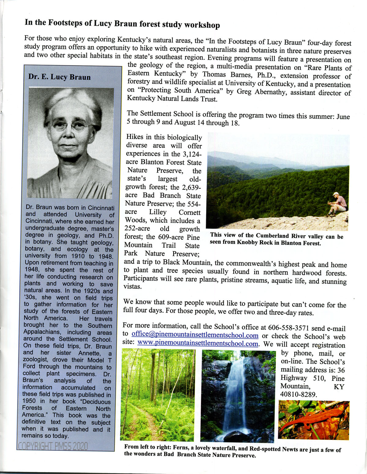 [006] In the Footsteps of Lucy Braun forest study workshop ; Dr. E. Lucy Braun biography and image ; Annette Braun ; hiking ; naturalists ; botanists ; nature preserves ; geology ; Thomas Barnes, Ph.D. ; University of Kentucky ; Greg Abernathy ; Kentucky natural Lands Trust ; Blanton Forest State Nature Preserve ; Bad Branch State Nature Preserve ; Lilley Cornett Woods ; Pine Mountain Trail State Park Nature Preserve ; Black Mountain [images] ;