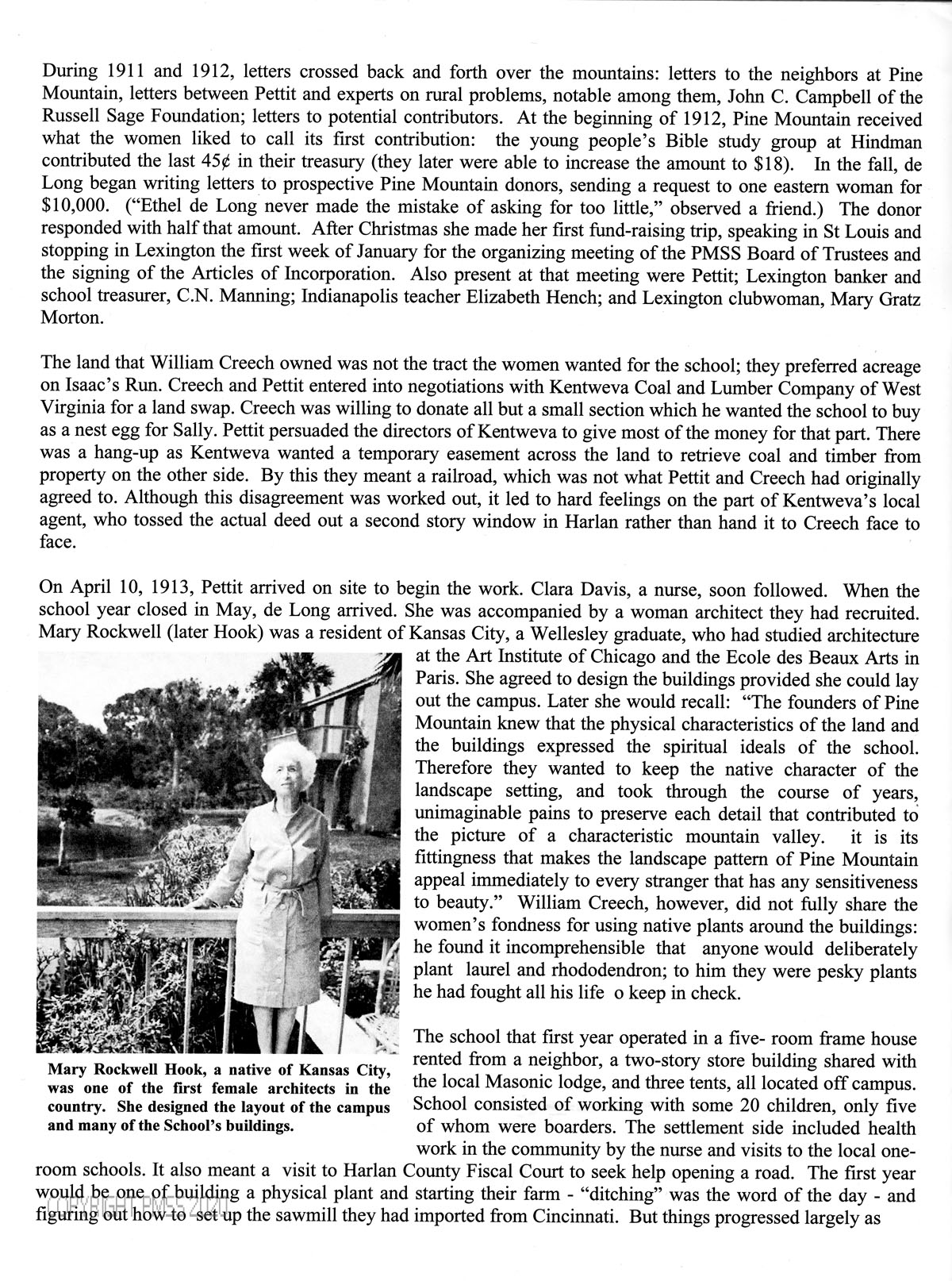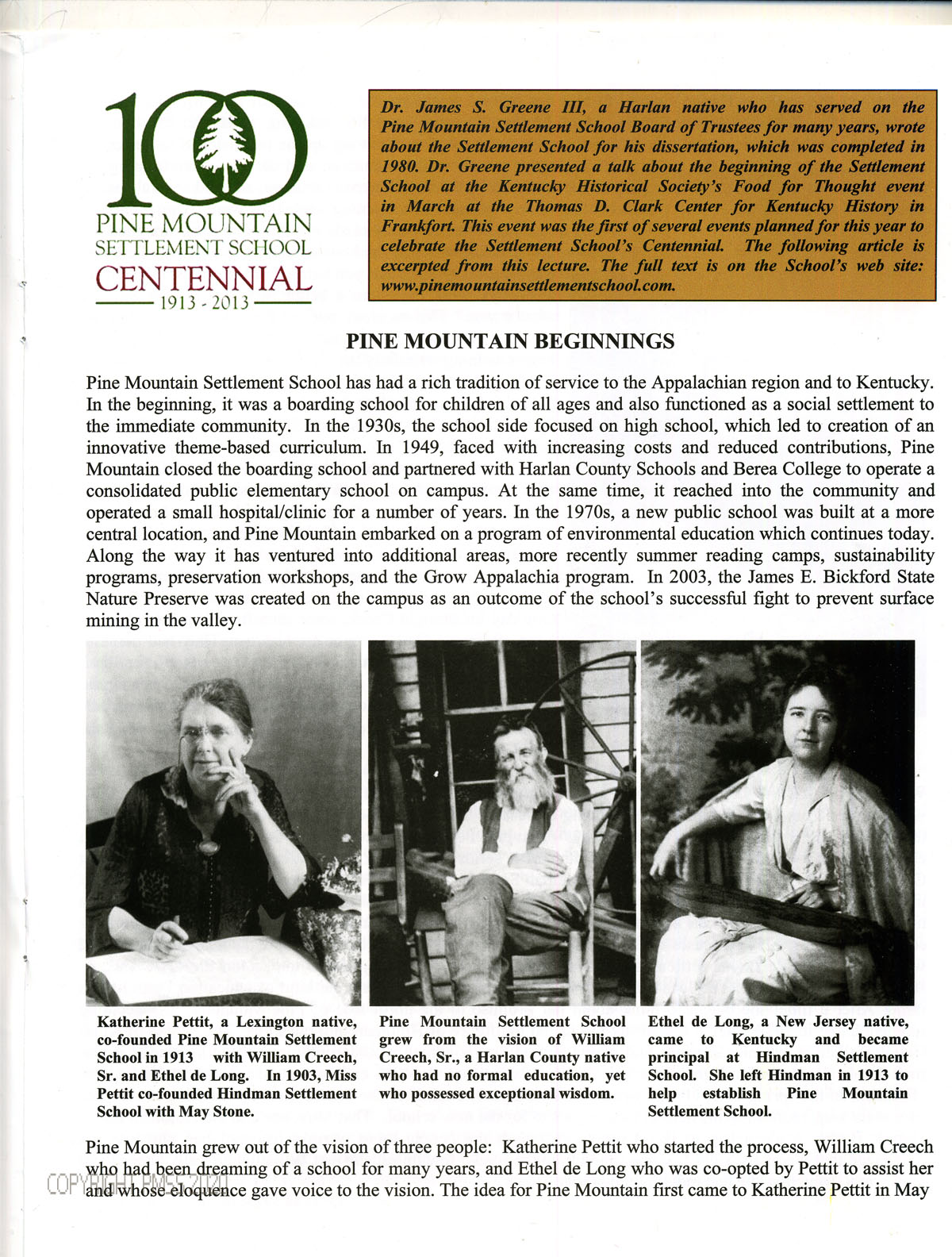 [008] [PMSS Centenial logo] Dr. James S. Greene III ; “Pine Mountain Beginnings” ; boarding school ; social settlement ; high school ; consolidated public element school ; hospital/clinic ; environmental education ; summer reading camps ; sustainability programs ; preservation workshops ; Grow Appalachia program ; James E. Bickford State Nature Preserve ; surface mining prevention ; Katherine Pettit; [image] ; William Creech, Sr. [image] ; Ethel de Long Zande [image] ;