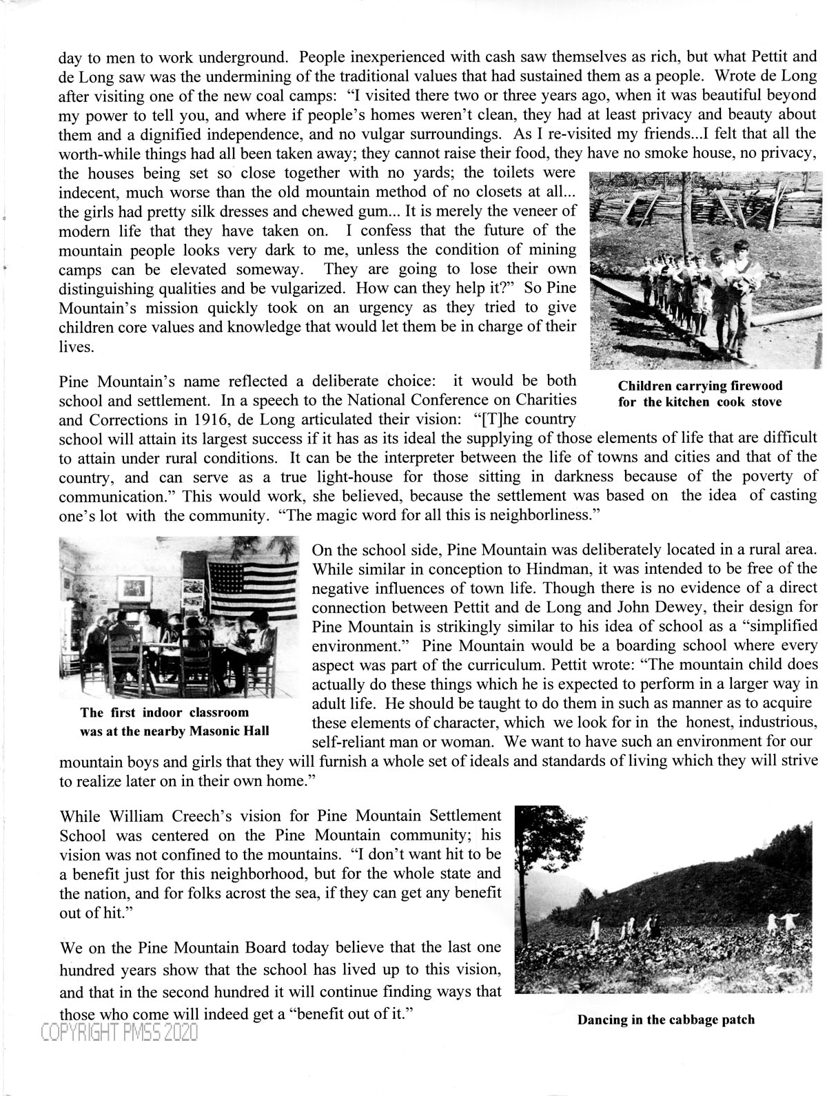 [014] coal camps ; children [image] ; modern life ; National Conference on Charities and Corrections ; neighborliness ; classroom in Masonic Hall [image] ; John Dewey ; boarding school ; William Creech’s vision ; dancing in the cabbage patch [image] ;