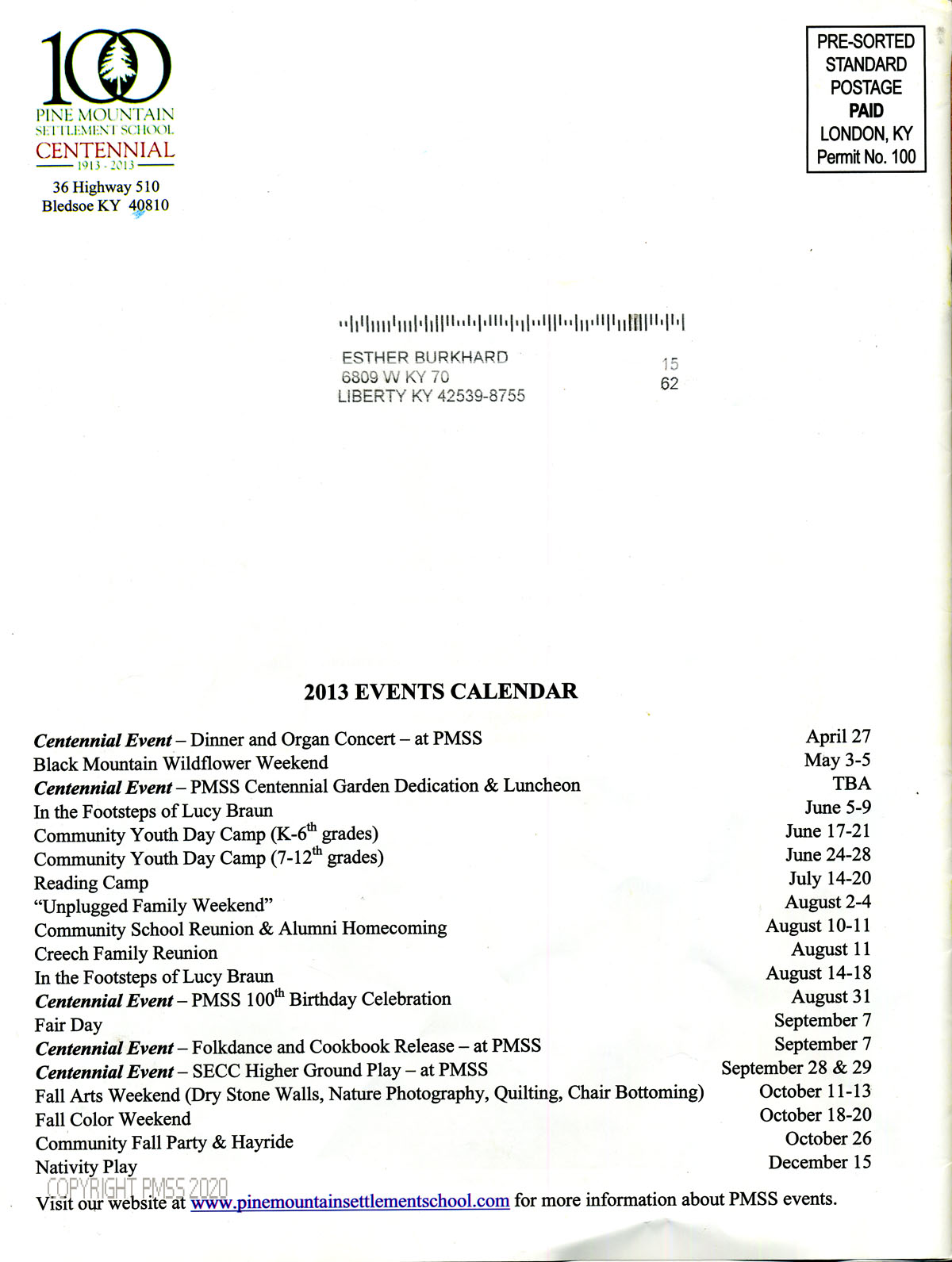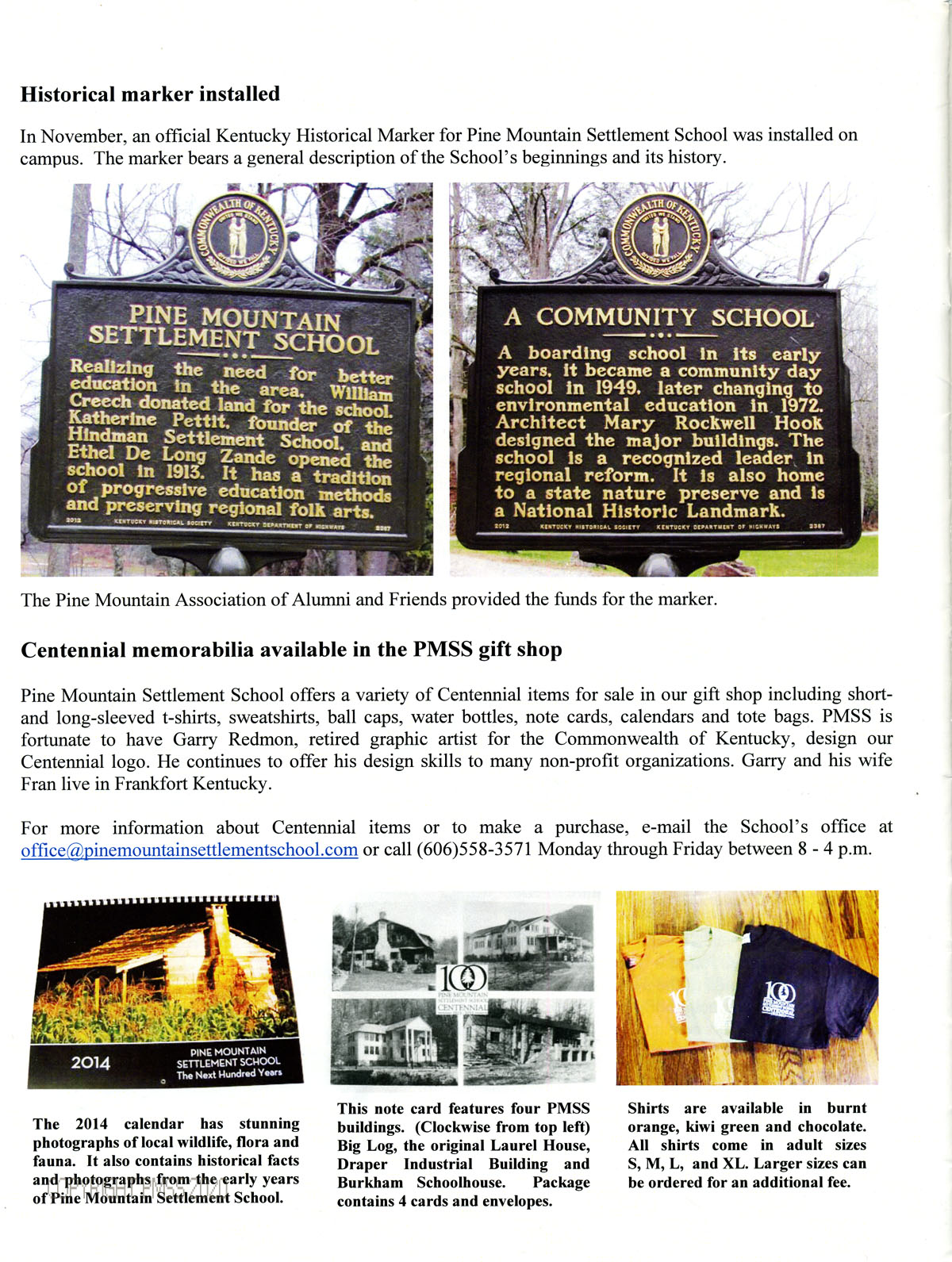 [015] Kentucky Historical Marker [images] ; Pine Mountain Association of Alumni and Friends ; Centennial memorabilia ; PMSS gift shop ; Garry Redmon, graphic artist ; Centennial logo ; email and phone number ; 2014 calendar [image] ; note cards [images] ; t-shirts ;