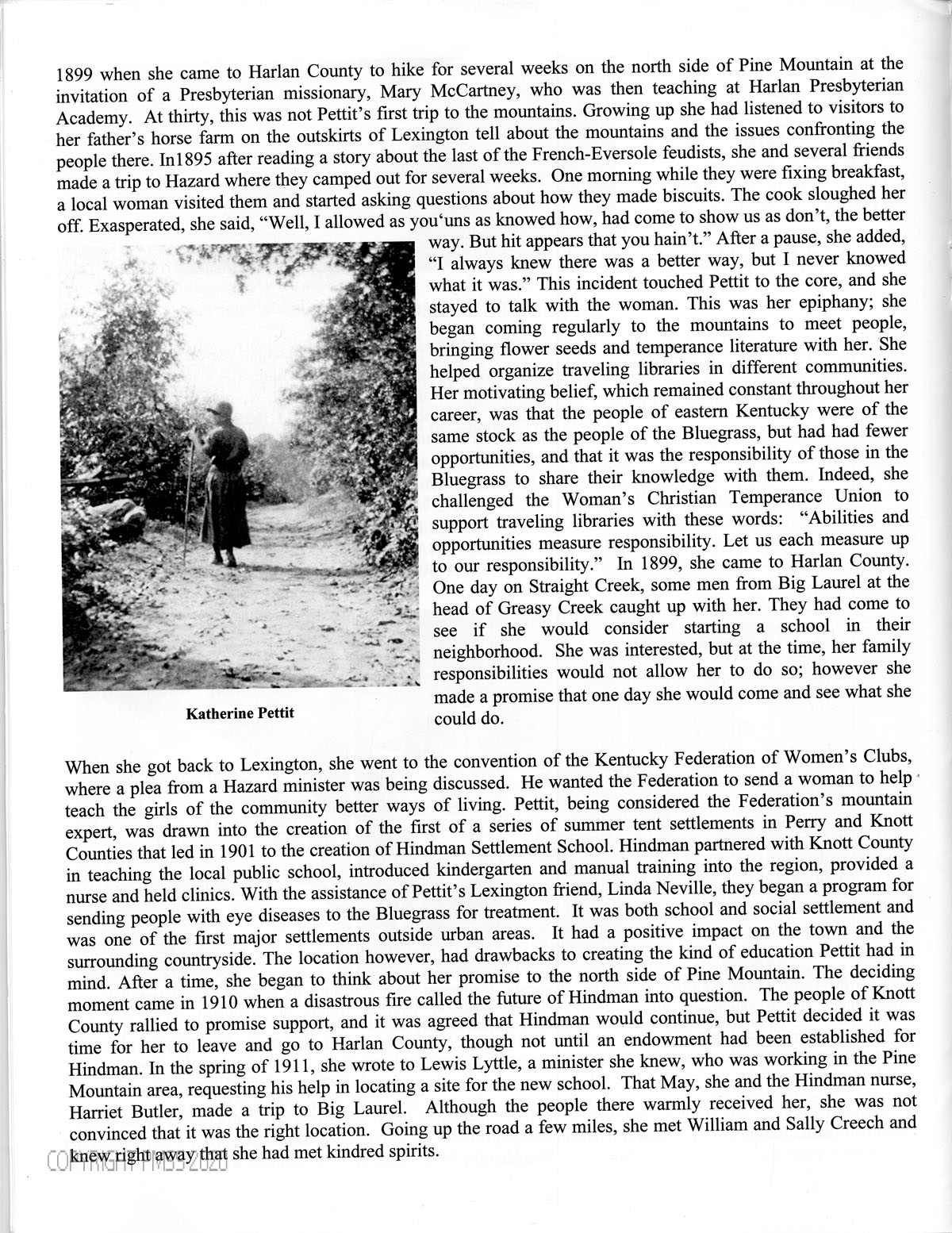 [009] Mary McCartney, Presbyterian missionary ; Harlan Presbyterian Academy ; Katherine Pettit [image] ; temperance literature ; traveling libraries ; Woman’s Christian Temperance Union ; Straight Creek ; Big Laurel ; Kentucky Federation of Women’s Clubs ; summer tent settlements ; Hindman Settlement School ; Knott County ; Perry County ; Linda Nevill ; eye diseases ; Harlan County ; Lewis Lyttle ; Harriet Butler ; William and Sally Creech ;