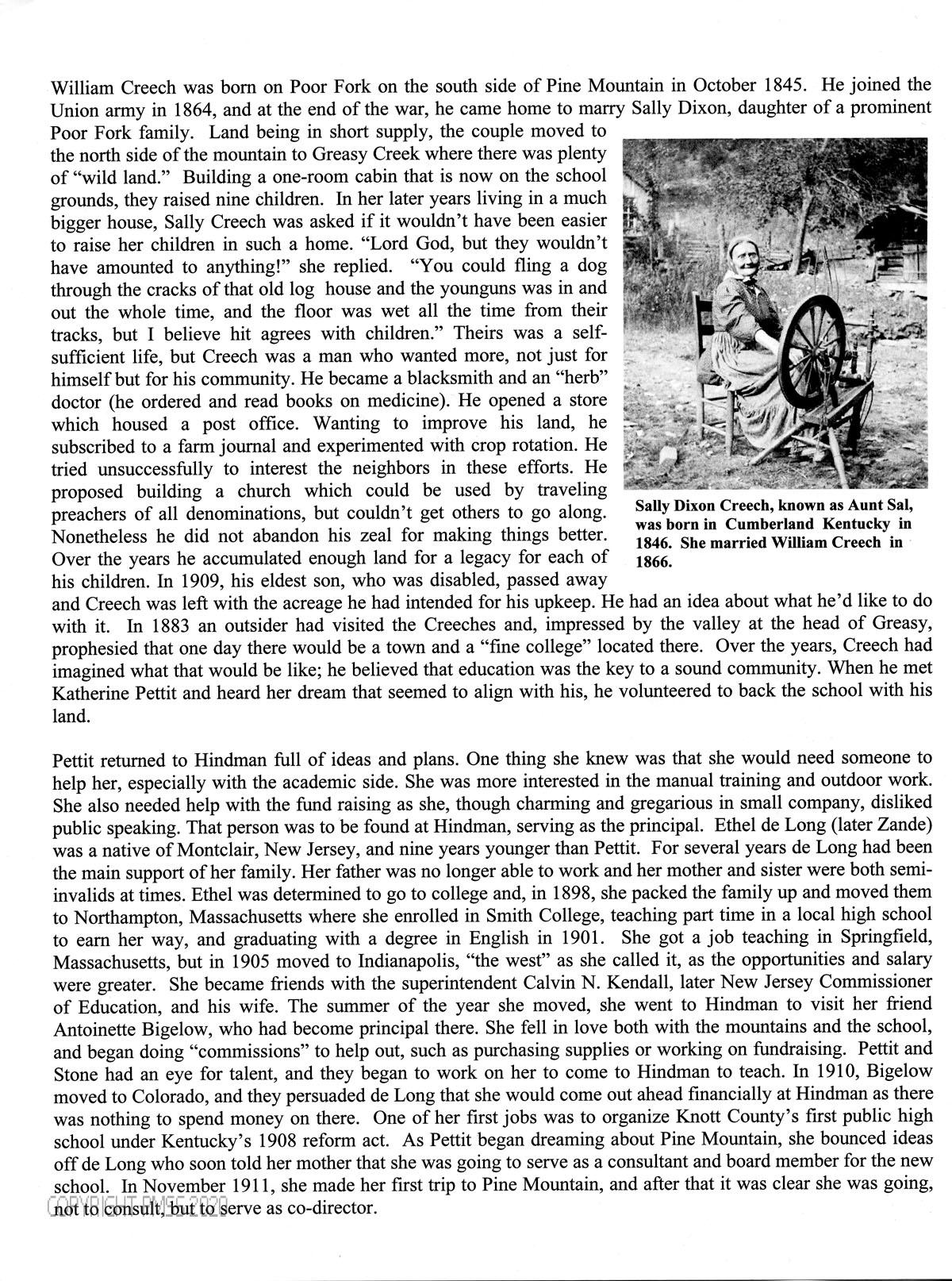 [010] William Creech ; Sally Dixon Creech [image] ; Greasy Creek ; Creech cabin ; blacksmith ; “herb” doctor ; post office ; crop rotation ; manual training ; fundraising ; Ethel de Long (Zande) biography ; Calvin N. Kendall, New Jersey Commissioner of Education ; Antoinette Bigelow ; Hindman Settlement School ; May Stone ; Knott County’s first public high school ; Kentucky’s 1908 reform act ;