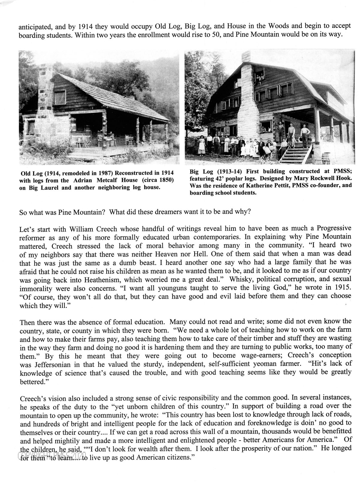 [012] Old Log [image] ; Adrian Metcalf House ; Big Log [image] ; House in the Woods ; boarding students ; poplar logs ; Mary Rockwell Hook ; Katherine Pettit ; William Creech, Progressive reformer ; lack of formal education, moral behavior ; civic responsibility ; the common good ; building a road ;