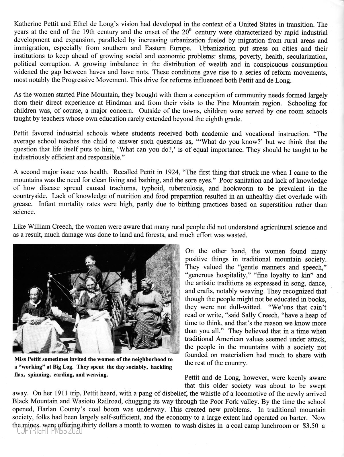 [013] rise of the Progressive Movement ; Katherine Pettit ; Ethel de Long ; community needs ; one-room schools ; industrial schools ; academic and vocational instruction ; health needs ; agricultural science ; traditional mountain society ; artistic traditions ; Black Mountain and Wasioto Railroad ; Poor Fork valley ; coal boom ;