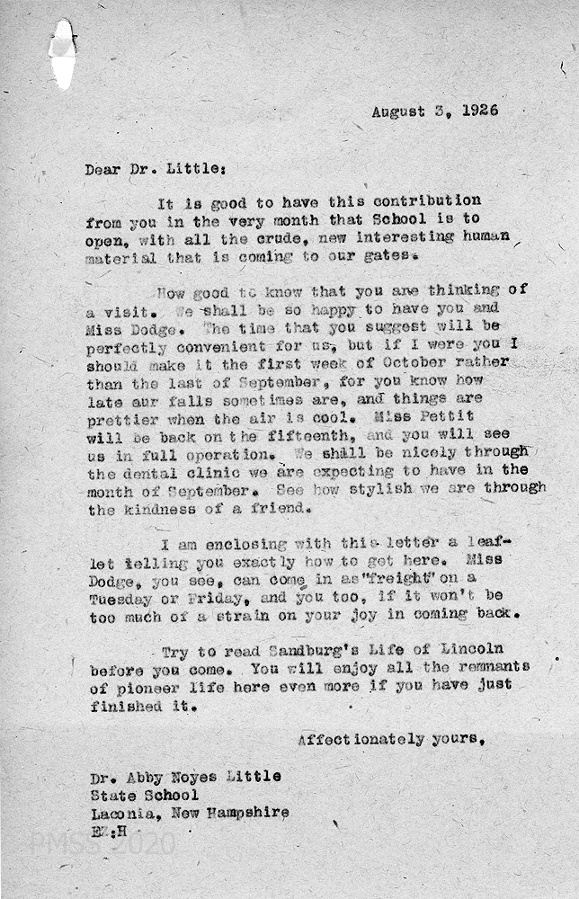 006 August 3, 1926. To Dr. Little from “EZ” (Ethel Zande), who thanks Little for her contribution. She welcomes Little and Miss [Mary] Dodge to visit in October, when Miss [Katherine] Pettit returns. The dental clinic will have ended in September. EZ encloses a leaflet with how to get to PMSS. Recommends reading Sandburg’s Life of Lincoln before arriving. “You will enjoy all the remnants of pioneer life here even more if you have just finished it.”