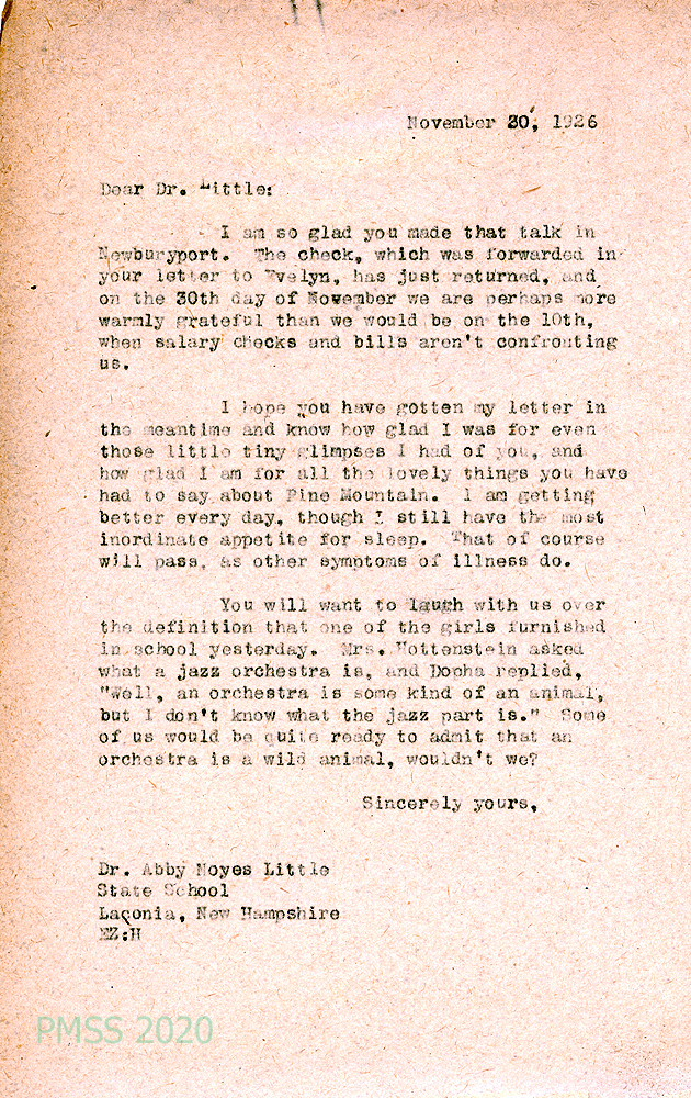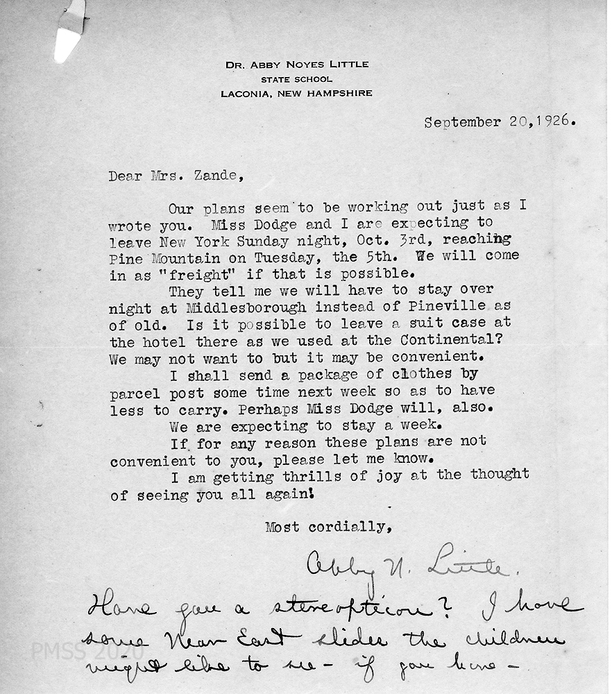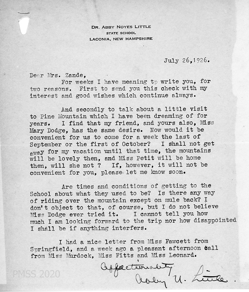 007 July 26, 1926. To Zande from Dr. Little, who sends a check to the School. Little is planning a visit to Pine Mountain with Zande’s and her friend, Miss Mary Dodge and asks the best time to do so and how to get there: “Is there any way of riding over the mountain except on mule back?” She mentions a letter from Miss Fawcett in Springfield and a visit by Miss Murdock, Miss Fitts and Miss Leonard. [Signed] “Affectionately, Abby N. Little.”
