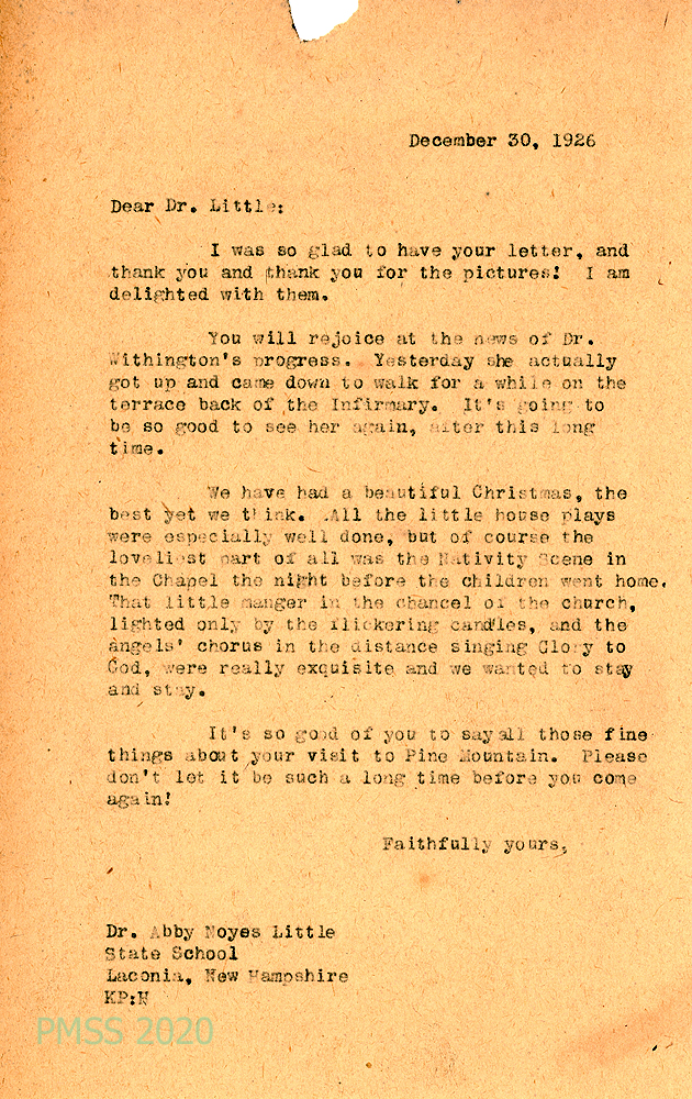 014 December 30, 1926. To Dr. Little from “KP” (Katherine Pettit), who thanks Little for the pictures; tells of Dr. [Alfreda] Withington’s recovery, walking “on the terrace back of the Infirmary”; describes the Nativity Scene in the Chapel.