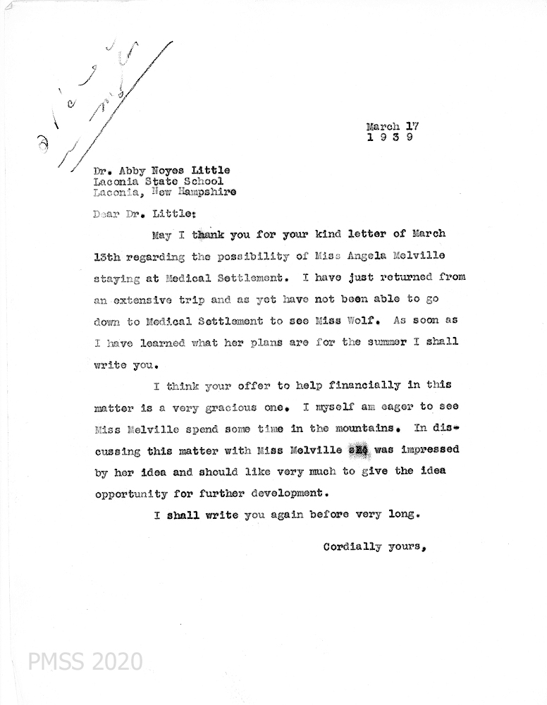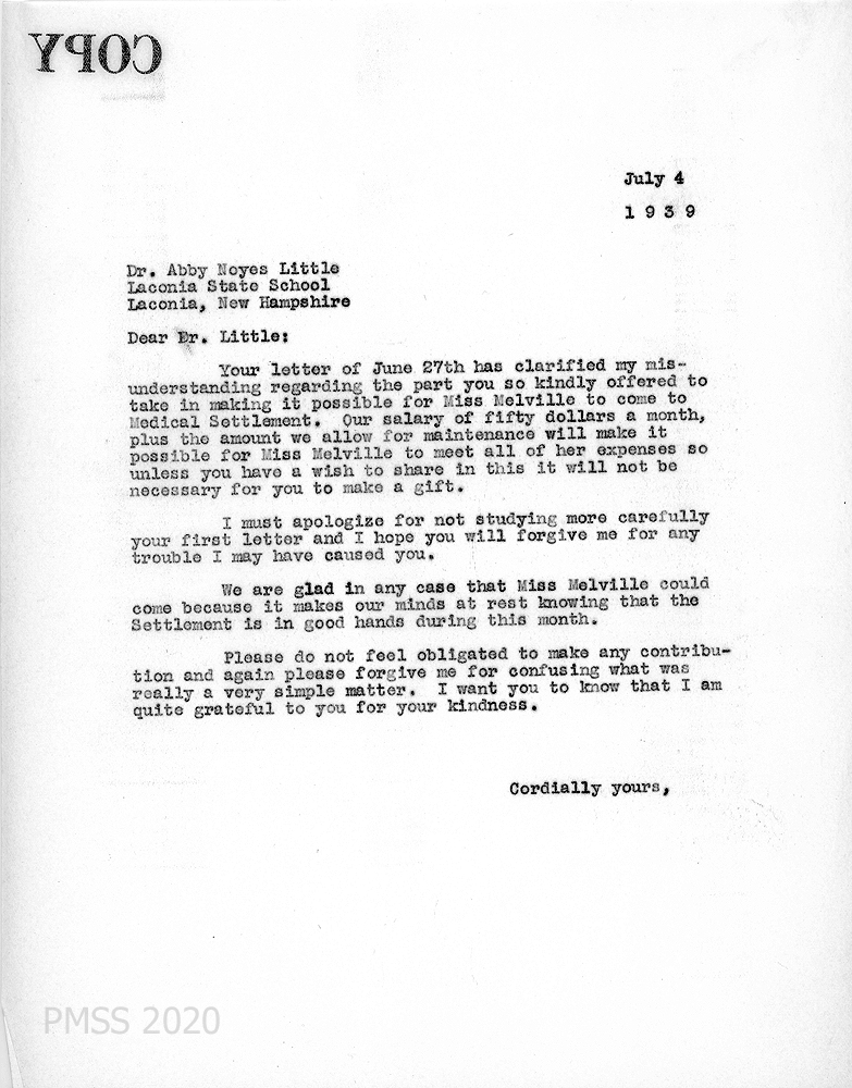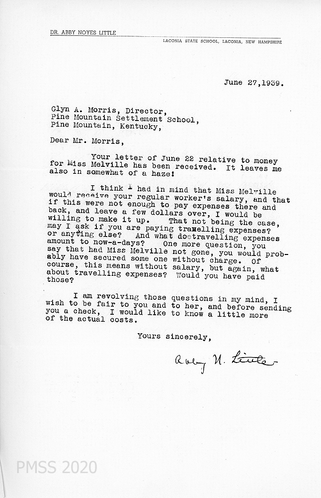 020 June 27, 1939. To Morris from Dr. Little ( letterhead shows her name and address). Asks for clarification of his letter of June 22 concerning her offer to financially help with funding Miss Melville’s position. She is willing to pay traveling expenses and asks about actual costs. [Signed] “Abby N. Little.”