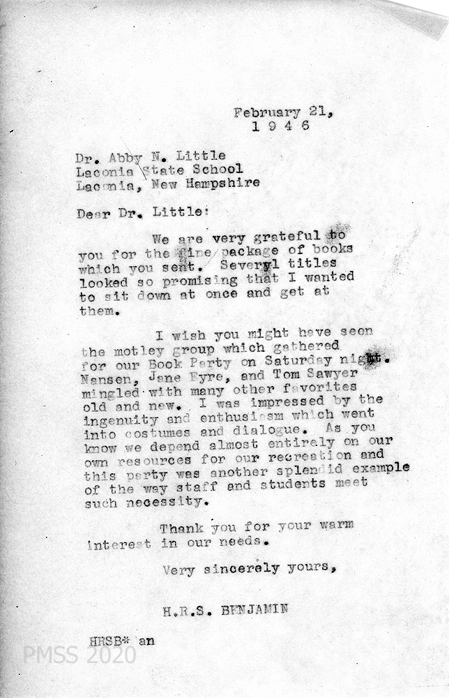 023 February 21, 1946. To Dr. Little from H.R.S. Benjamin, who thanks Little for the books she sent; describes the Book Party, to which attendees came dressed as characters in books. “…[W]e depend almost entirely on our own resources for our recreation and this party was another splendid example of the way staff and students meet such necessity.”