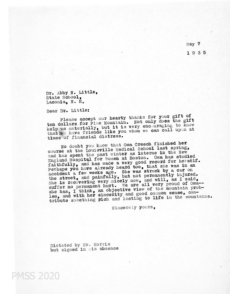 “...Oma Creech finished her course at the Louisville Medical School last spring, and has spent the past winter as interne (sic) in the New England Hospital for Women in Boston…. She was in an accident a few weeks ago. She was struck by a car on the street, and painfully, but not permanently injured. She is recovering very nicely now…. We are all very proud of Oma — she has, I think, an objective view of the mountain problem, and with her sincerity and good common sense, contribute something rich and lasting to life in the mountains.”