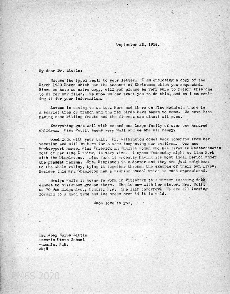 001 September 28, 1928. To Dr. Abby Noyes Little from “AM” (likely Angela Melville). As requested, the writer encloses March 1920 Notes, which has an account of Christmas and asks Little to return it for PMSS files. AM describes the autumn weather and how well everyone is, including over 100 children in “our large family” and Miss [Katherine] Pettit. AM relates campus news: