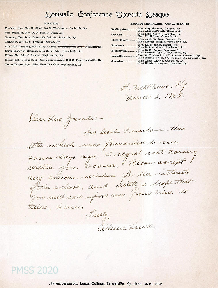 021 March 2, 1925. To Mrs. Zande from Lewis at St. Matthews, Ky. on letterhead for “Louisville Conference Epworth League.” Lewis encloses a letter that was forwarded to her. “Please accept my sincere wishes for the interests of the school and with a hope that you will call upon me from time to time.”