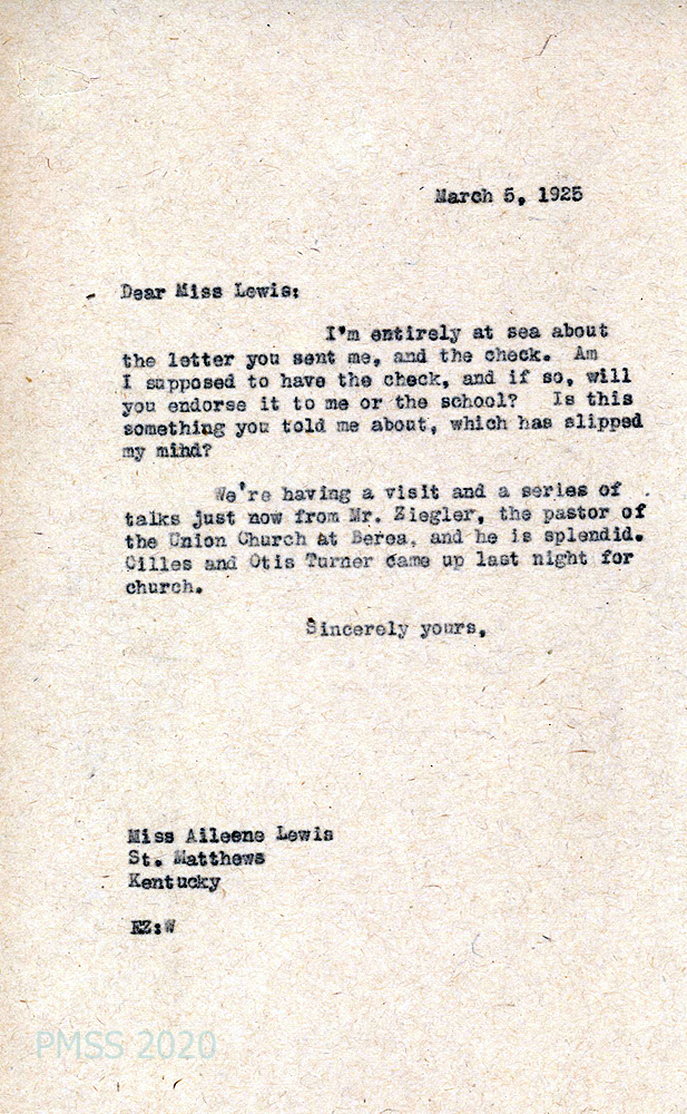 022 March 5, 1925. To Lewis in St. Matthews, Ky., from EZ, who is “at sea about the letter you sent me, and the check.” She asks Lewis to explain. Mentions Mr. Ziegler, pastor of the Union Church at Berea, who is visiting. Also, Cilles(?) and Otis Turner came to church.