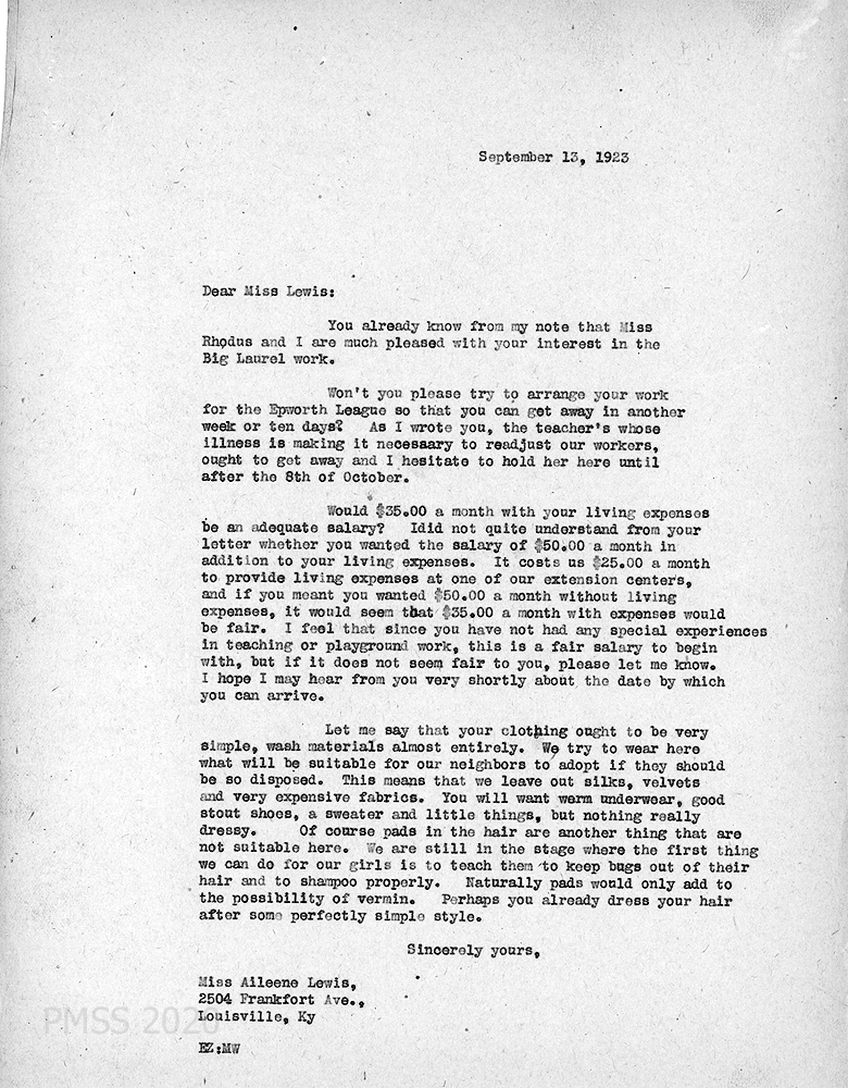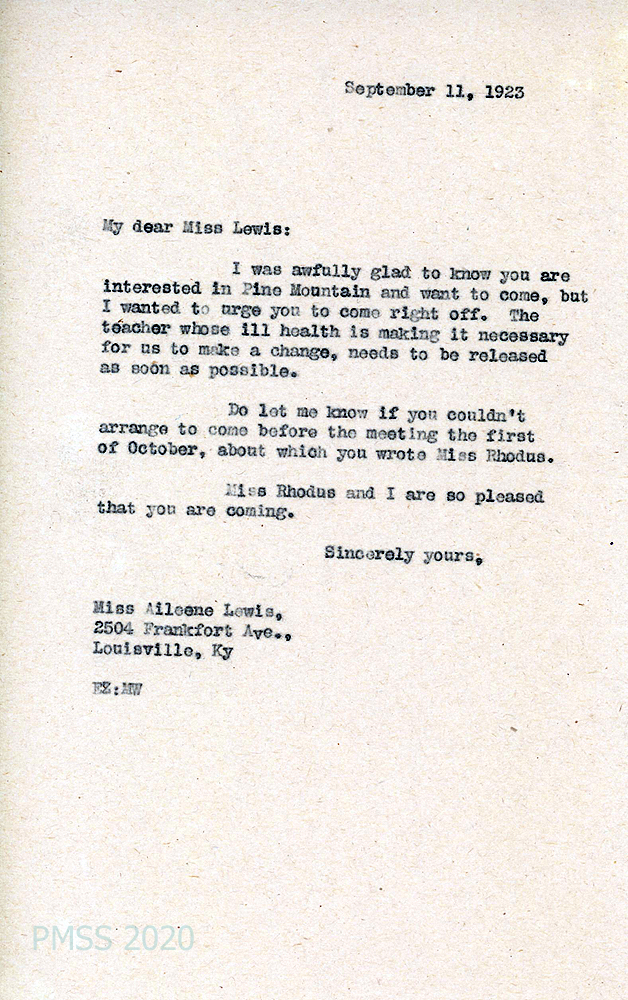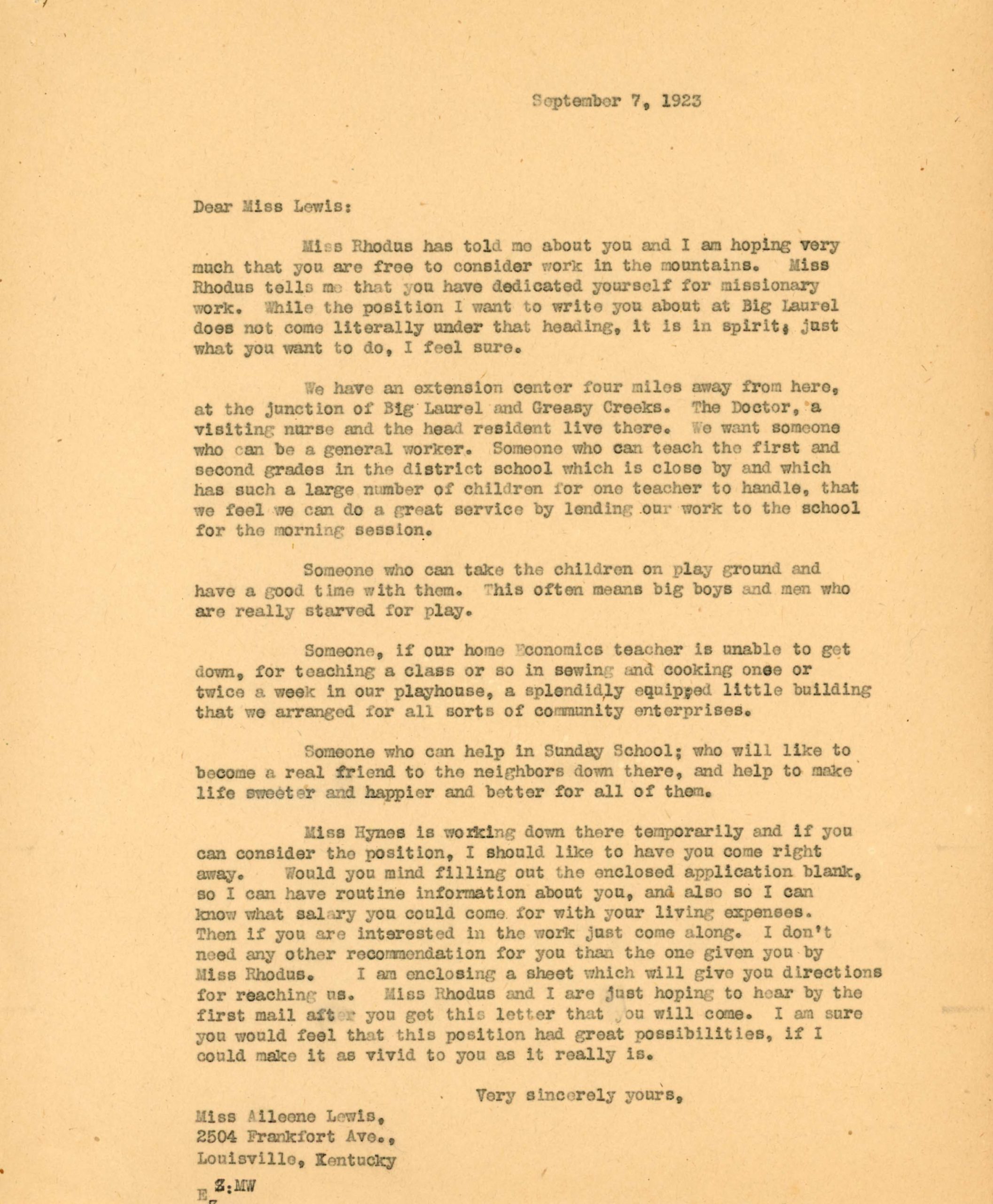 001x September 7, 1923. To Miss Aileene Lewis in Louisville, KY, from EZ (Ethel de Long Zande), who writes that Miss Eva Rhodus [housemother & teacher] recommended Lewis to EZ and asks Lewis to consider “work in the mountains.” Although Lewis’s life was dedicated to missionary work, EZ assures her that work at Big Laurel is in that spirit, if not literally.