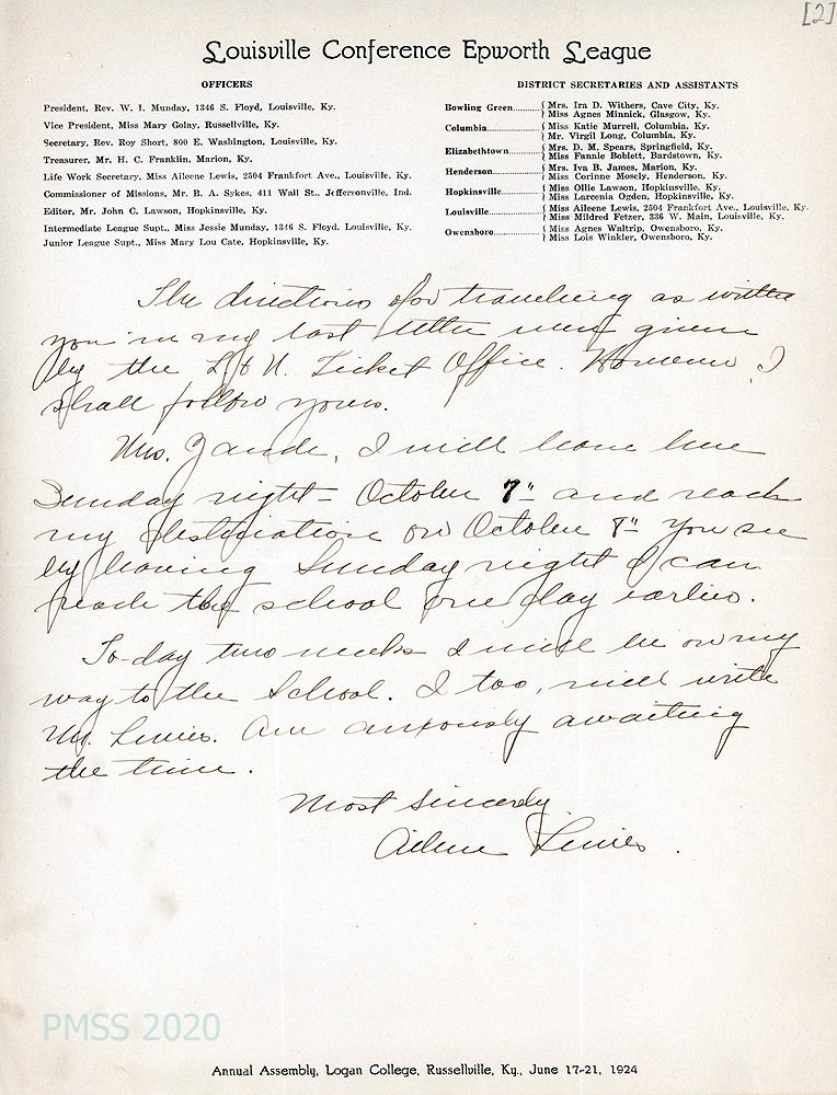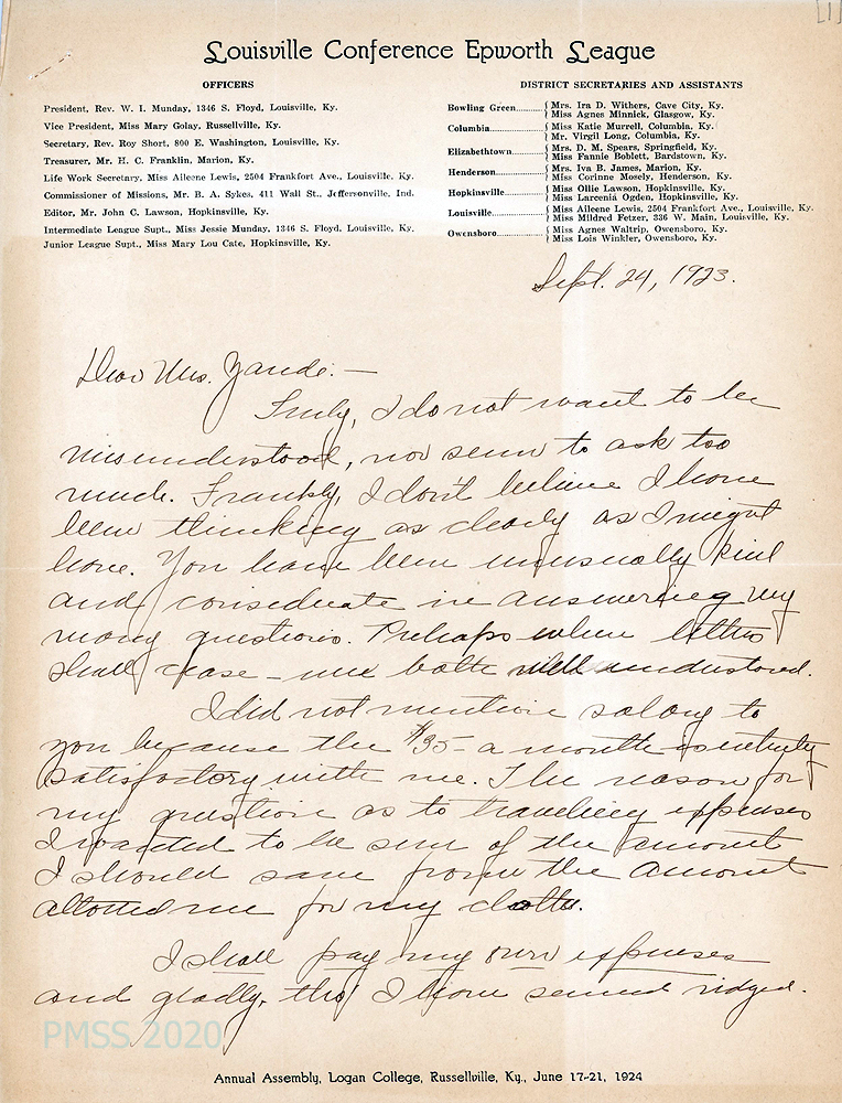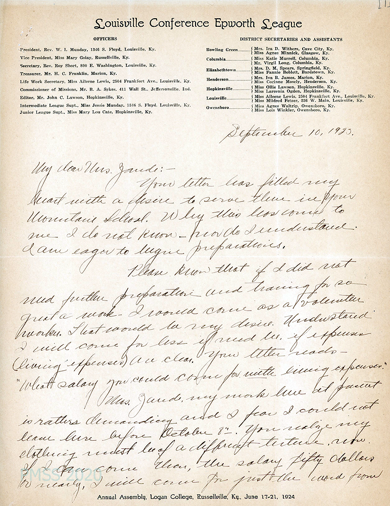 002, 002a September 10, 1923. Two-page letter to Mrs. Zande from Aileene Lewis on a letterhead for “Louisville Conference Epworth League” which lists Aileene Lewis of Louisville as a “Life Work Secretary.” “ My dear Mrs. Zande:- Your letter has filled my heart with a desire to serve there in your Mountain School.” Lewis offers to come as a volunteer worker “if she did not need further preparation and training for so great a work.” She mentions a salary of about fifty dollars.