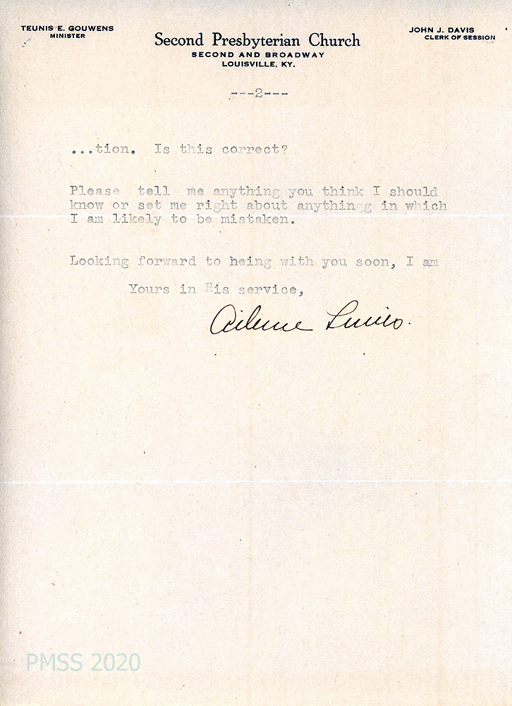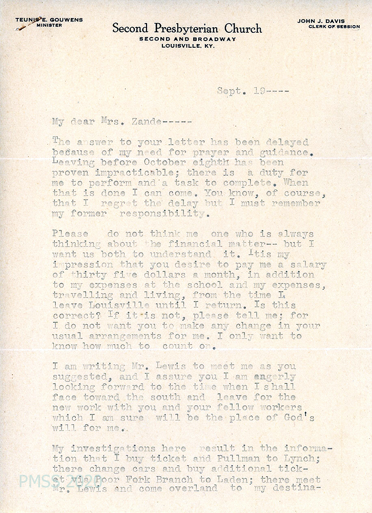 006, 006a September 19, 1923. A two-page typewritten letter to Mrs. Zande from Lewis on a “Second Presbyterian Church, Louisville, KY,” letterhead. 006 Miss Lewis responds that she cannot leave her former position earlier, stating “… [T]here is a duty for me to perform and a task to complete.”