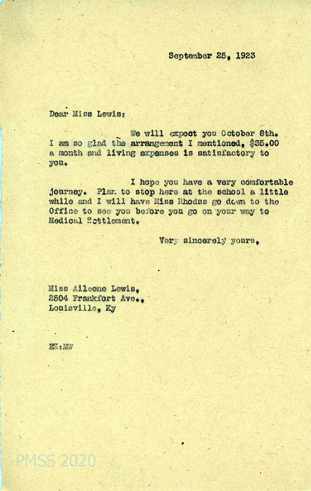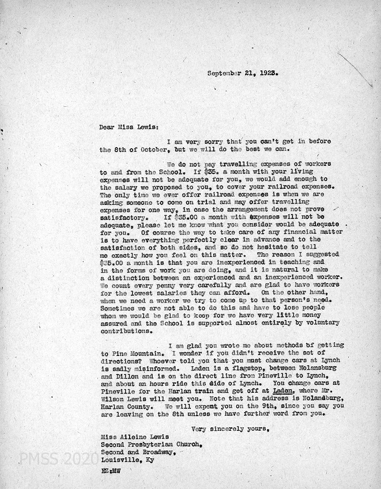 007 September 21, 1923. To Lewis from EZ, who regrets that Lewis cannot arrive at an earlier date. She explains that the School does not pay travel expenses, except a one-way payment when someone is asked to come to PMSS on trial and does not stay. She asks Lewis to let her know if $35 a month with expenses is not adequate. She explains the School’s reasoning concerning how much workers are paid. EZ then makes corrections to the travel directions that Lewis described.