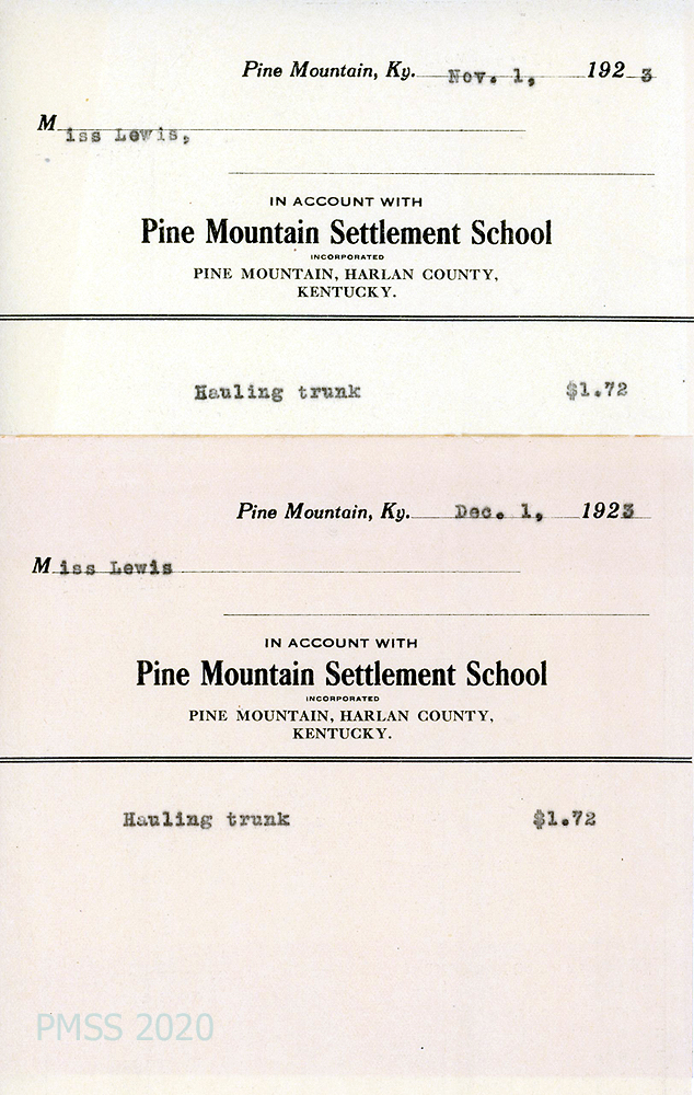 010 November 1 and December 1, 1923. To Miss Lewis, two bills from PMSS, each for “Hauling trunk, $1.72”.