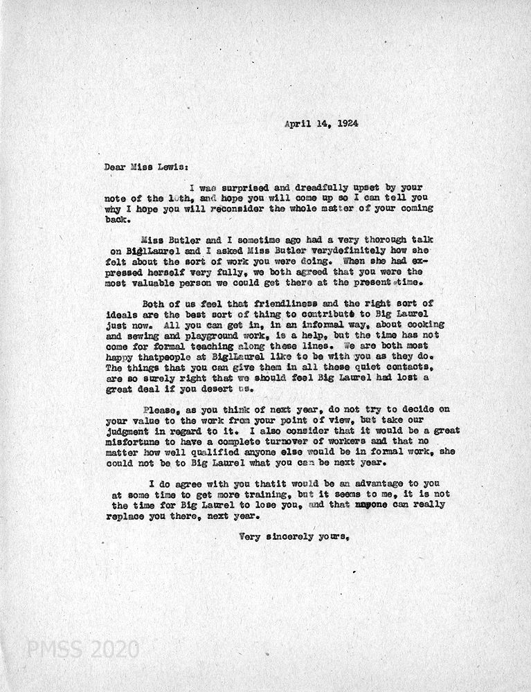011 April 14, 1924. To Lewis from [unsigned, likely EZ], who was upset by her April 10th note about not returning to PMSS next year in order to pursue further training. EZ wrote that she had consulted with Miss [Harriet] Butler about Lewis’s work, and “we both agreed that you were the most valuable person we could get there at the present time…. That friendliness and the right sort of ideals are the best sort of thing to contribute to Big Laurel just now…. “ She assures Lewis that her informal assistance with cooking, sewing and playground work is preferred to a formal, more qualified teacher. “We are both most happy that people at Big Laurel like to be with you as they do…. [Also,] it would be a great misfortune to have a complete turnover of workers.”