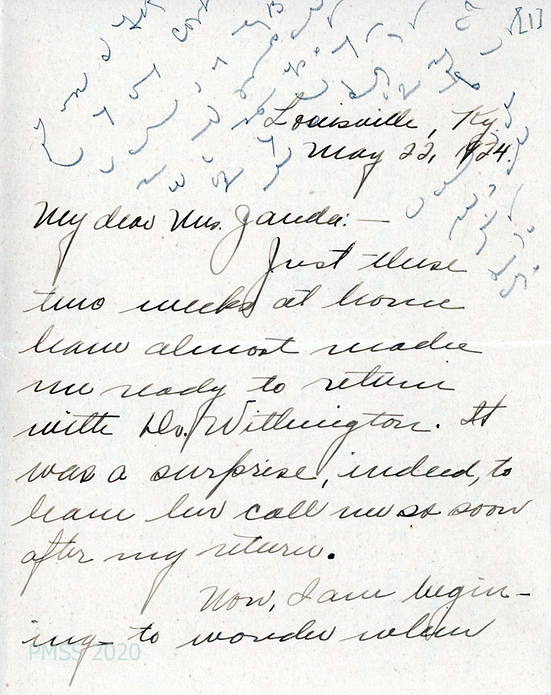 019a (Page 2) “…I regret to leave the work and tho’ I am leaving, as long as I am in Louisville I would like to serve the Mountain people when they are in that city, if you would so desire. … This is merely a note to tell you that we are planning to leave the Mountains on Friday of this week. I realize, Mrs. Zande, that this makes my term short but it cannot be helped.”