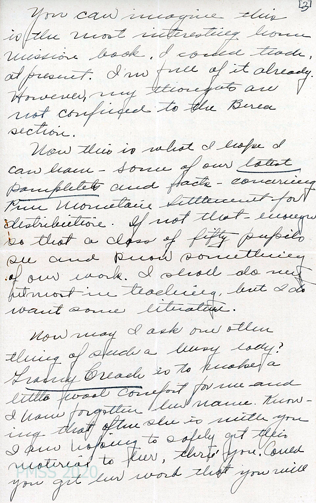 012a (Page 3) Miss Lewis asks for two things: the School’s latest pamphlets and facts about Pine Mountain Settlement for distribution, at least enough for a class of fifty pupils. She would also like to send material, through Zande, to Granny Creech who “is to make a little wool comfort for me.”