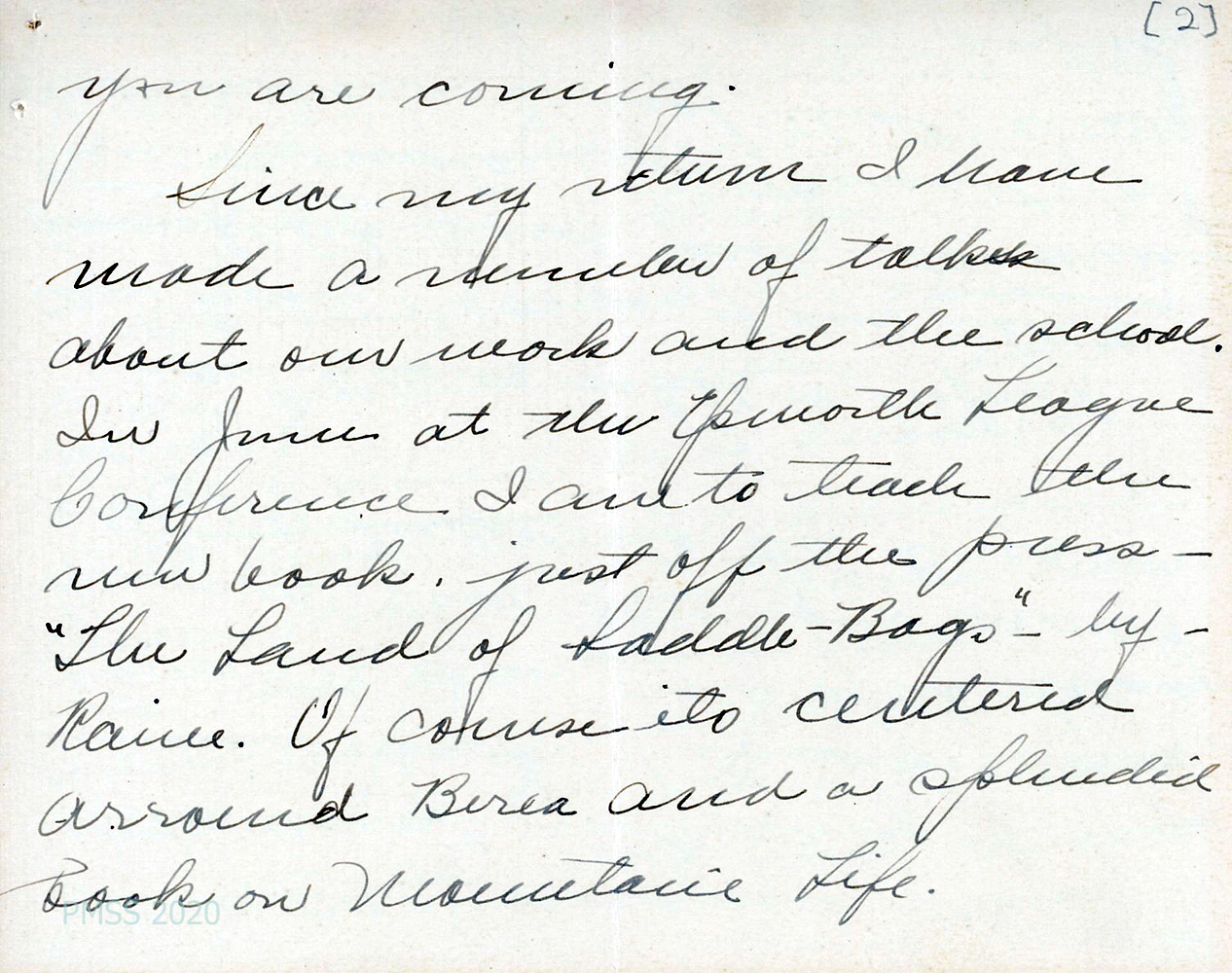 012b (Page 2) you are coming. Since my return, I have made a number of talks about our work and the school. In June at the Epworth League Conference I am to teach the new book — just off the press — “The Land of Saddle-Bags” by [James Watt] Raine. Of course, it’s centered around Berea and a splendid book on Mountain Life.”