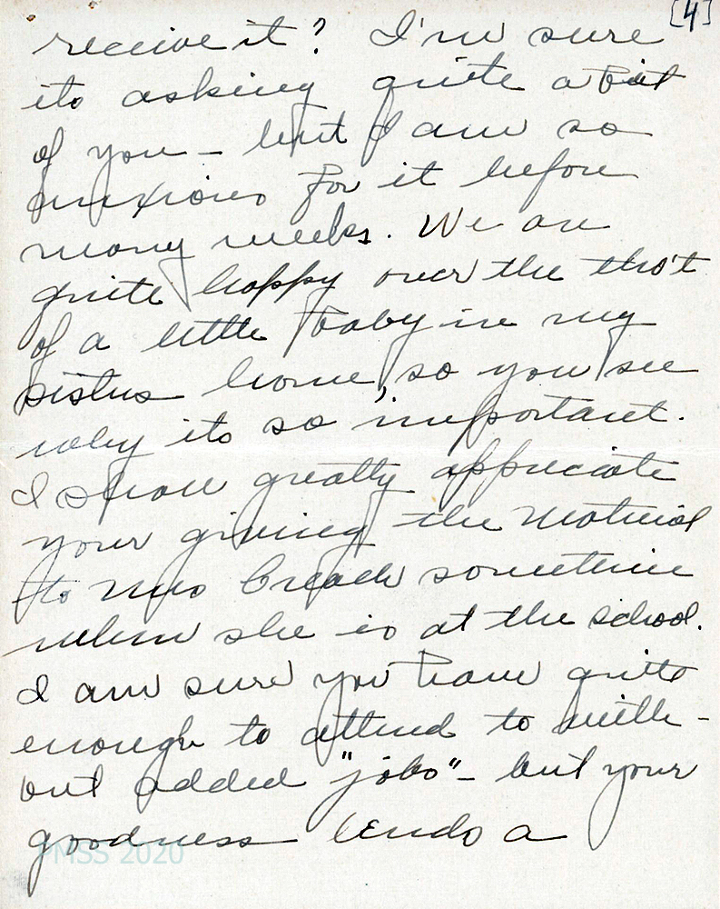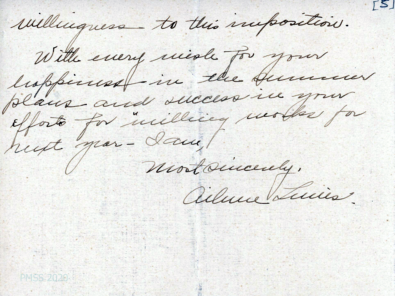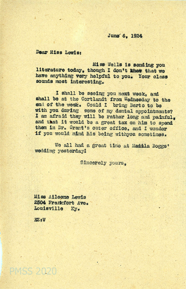 Letters from PMSS staff are typewritten carbon copies and unsigned, as they are meant for the office files. Initials at the bottom left of most letters indicate the writer (and the secretary), such as “EZ” for Ethel Zande. Letters from Aileene Lewis (Nesbitt) are handwritten unless indicated otherwise.