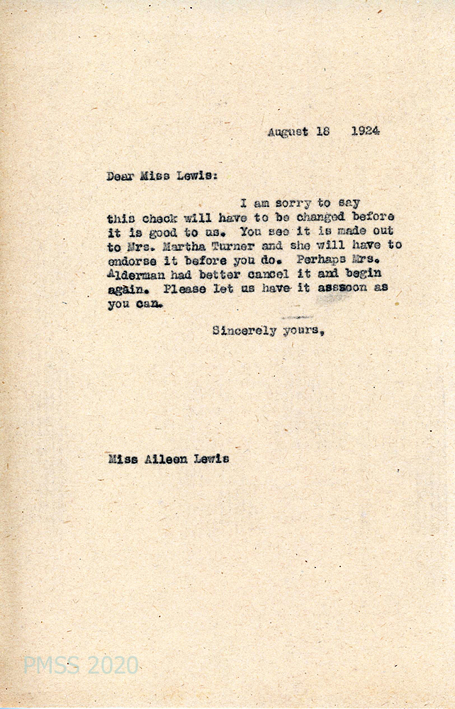 014 August 18, 1924. To Lewis from [unsigned]. Returning a check that needed to be changed in order for the School to cash it.
