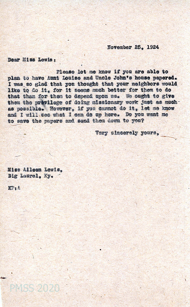 015 November 25, 1924. To Lewis at Big Laurel, Ky., from KP (Katherine Pettit), who asks if Lewis plans to have Aunt Louise and Uncle [Fiddler] John [Lewis]’s house papered and that the neighbors may like to do it. “We ought to give them the privilege of doing missionary work just as much as possible.”