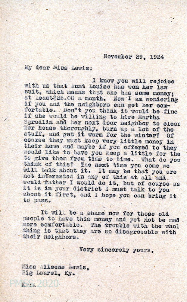 016 November 29, 1924. To Lewis at Big Laurel, Ky., from KP, reporting the news that Aunt Louise won her lawsuit and will receive at least $25.00 a month. She suggests that maybe Aunt Louise would hire Martha Spradlin and her neighbor to clean her home and make it warm for winter. “It will be a shame now for those old people to have this money and yet not be made more comfortable….”