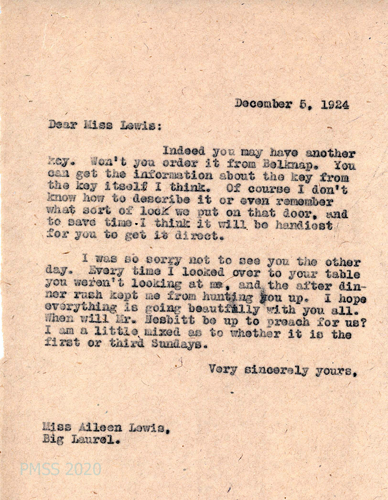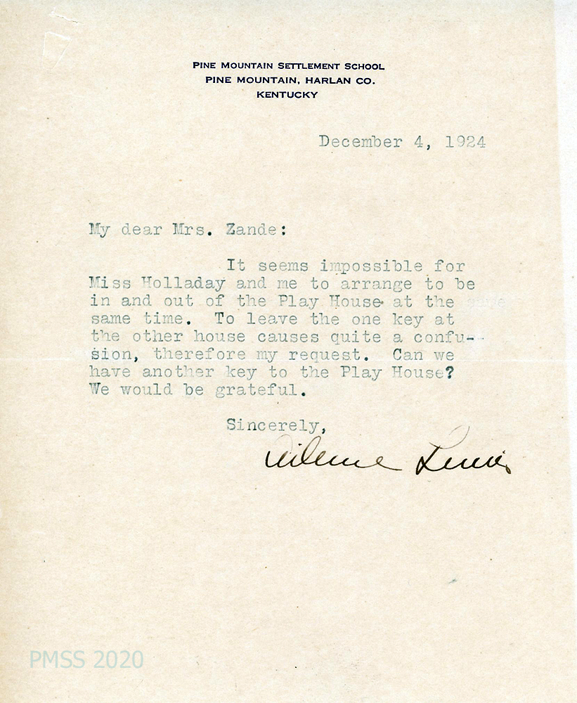 017 December 4, 1924. A typewritten note to Mrs. Zande from Lewis on PMSS letterhead, who asks for a second key for the Play House, since Miss [Iva] Holladay currently has the only key.