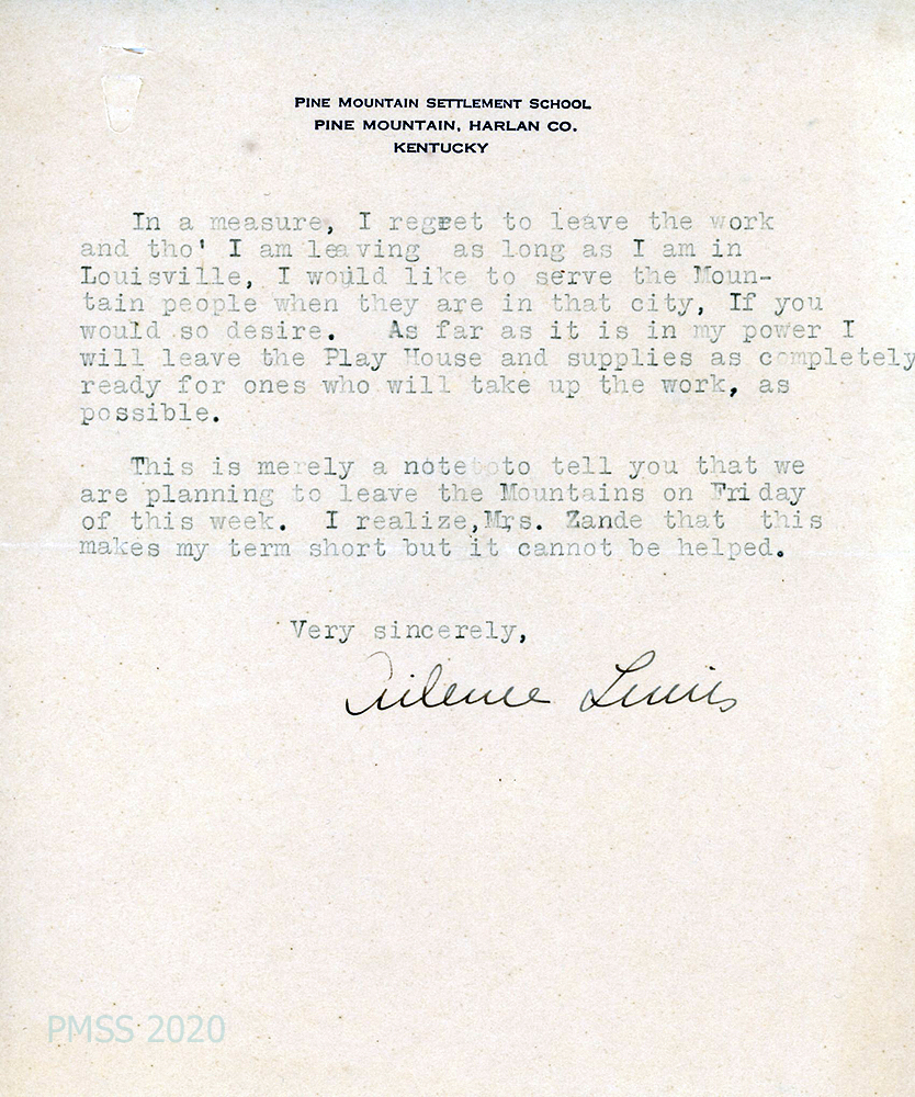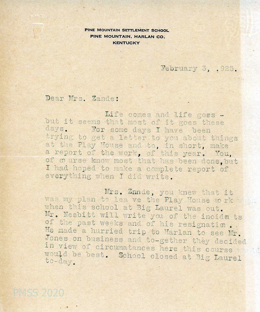 019, 019a February 3, 1925. A typewritten two-page letter to Mrs. Zande from Lewis on PMSS letterhead. 019 It has been Lewis’s plan to leave the Play House work when Big Laurel school closed, which it did today. “Mr. Nesbitt will write you of the incidents of the past weeks and of his resignation,” which occurred after consulting with Mr. Jones in Harlan.