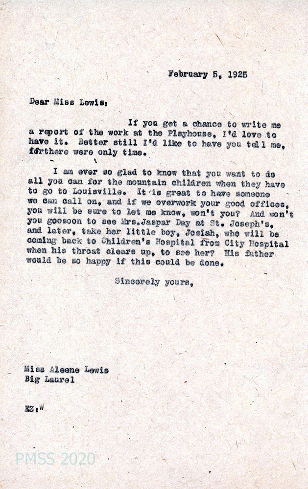020 February 5, 1925. To Lewis at Big Laurel from EZ, who would like a report of the work at the Play House. “I am ever so glad to know that you want to do all you can for the mountain children when they have to go to Louisville.” She asks Lewis to see Mrs. Jasper Day (Nancy Shepherd) at St. Joseph’s and to bring her little boy, Josiah, to see her.