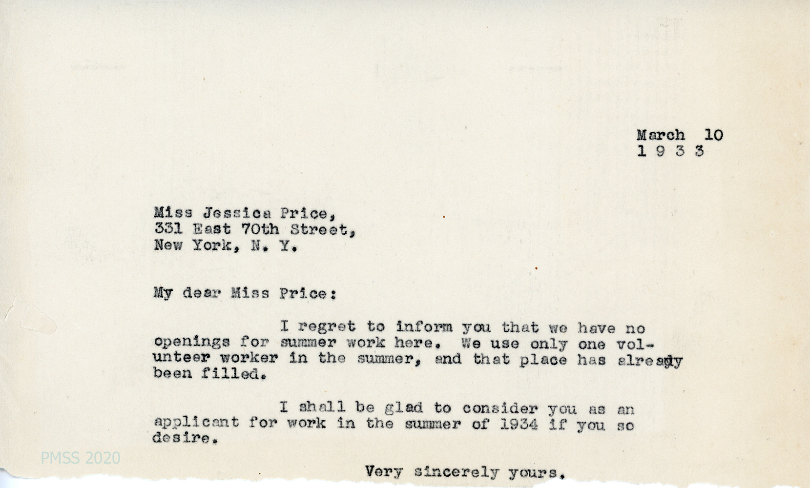 [019] March 10, 1933. To Price from [unsigned], informing her that there are no summer openings, except for a volunteer position that has been filled; can consider Price for summer of 1934.