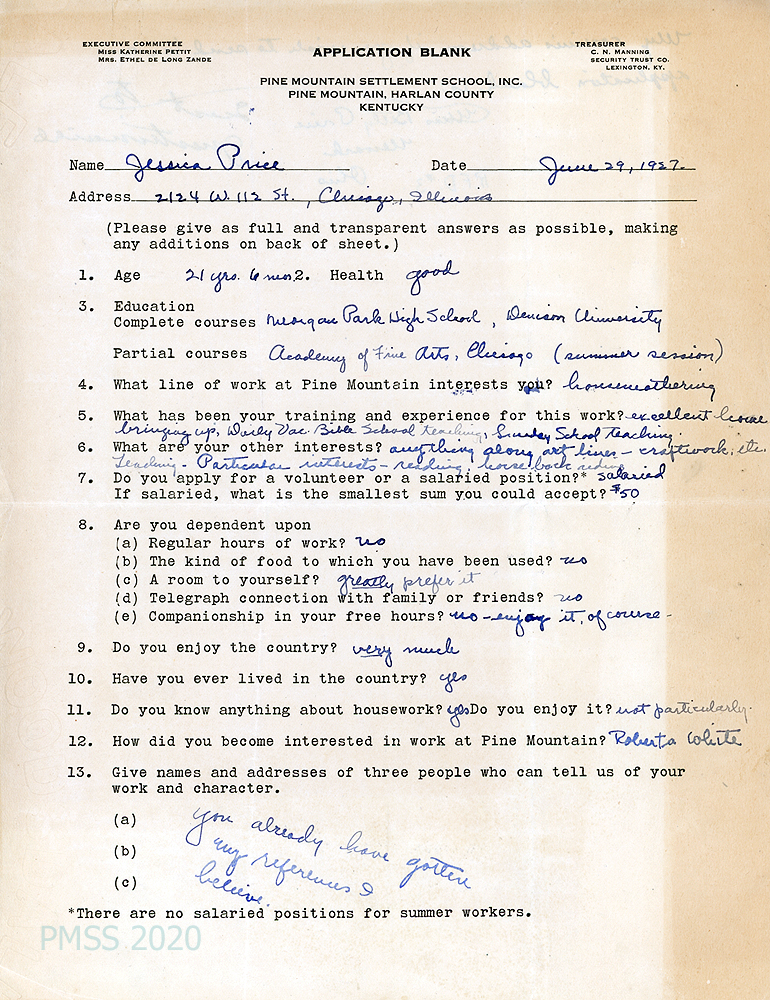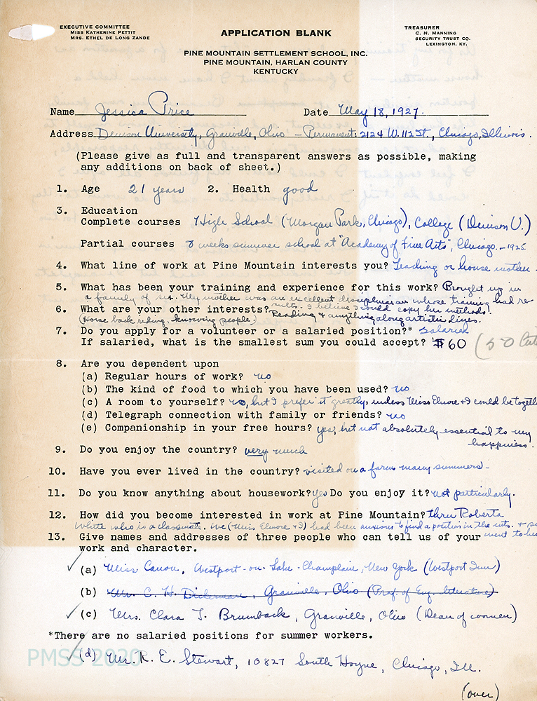 TAGS: Jessica Price correspondence, PMSS staff, housemothers, artists, applications for PMSS employment, Denison University, Big Log housemothers, references, Lenox Hill Neighborhood Association, Henry Street Settlement, Polly Wilder, Rev. James Morse