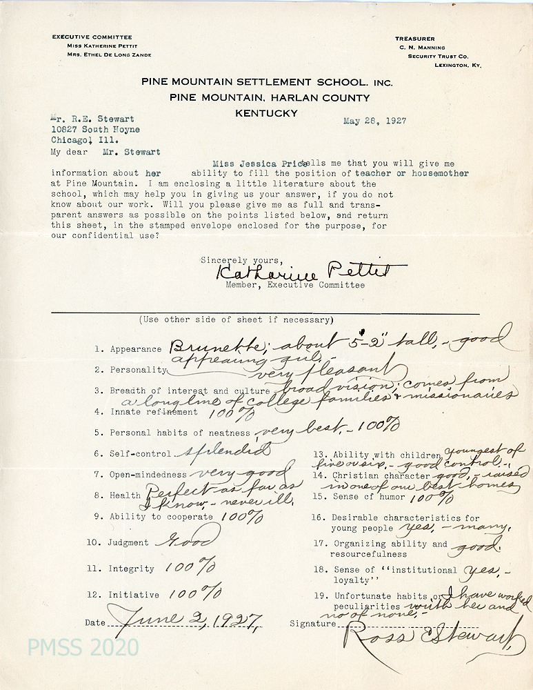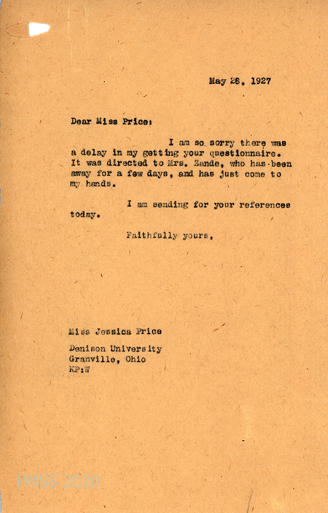 [006], [006a] June 2, 1927. Two-page typewritten letter to Miss Katherine Pettit from Ross E. Stewart, Chicago, IL, [006] who encloses his reference form for Jessica. “She comes from a long line of college educated families on both sides and also from a long line of missionary families.” He tells of her family’s longtime association with Denison College; that she is the youngest of six children. “We have no finer family in the Morgan Park Baptist Church than the Price[s]. They have been in Morgan Park for very, very many years….” Just before college, Jessica was president of the Baptist Young Peoples’ Union (BYPU) and that year was “one of the best in the history of BYPU work. She has splendid executive ability, is a good planner, keeps her mind on her work….” [006a] “Her manners are simple and plain, as is her dress, but refinement in the extreme.”