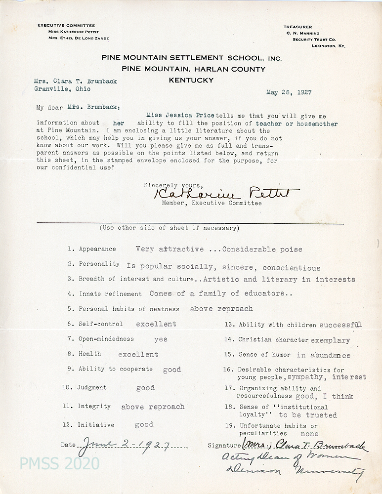[004] June 2, 1927. To Pettit from Mrs. Clara T. Brumback, acting Dean of Women, Denison University, Granville, OH, who provides typewritten entries on a form (sent to her by Pettit on May 28) concerning Jessica’s abilities: “Artistic and literary in interest…comes of a family of educators… “